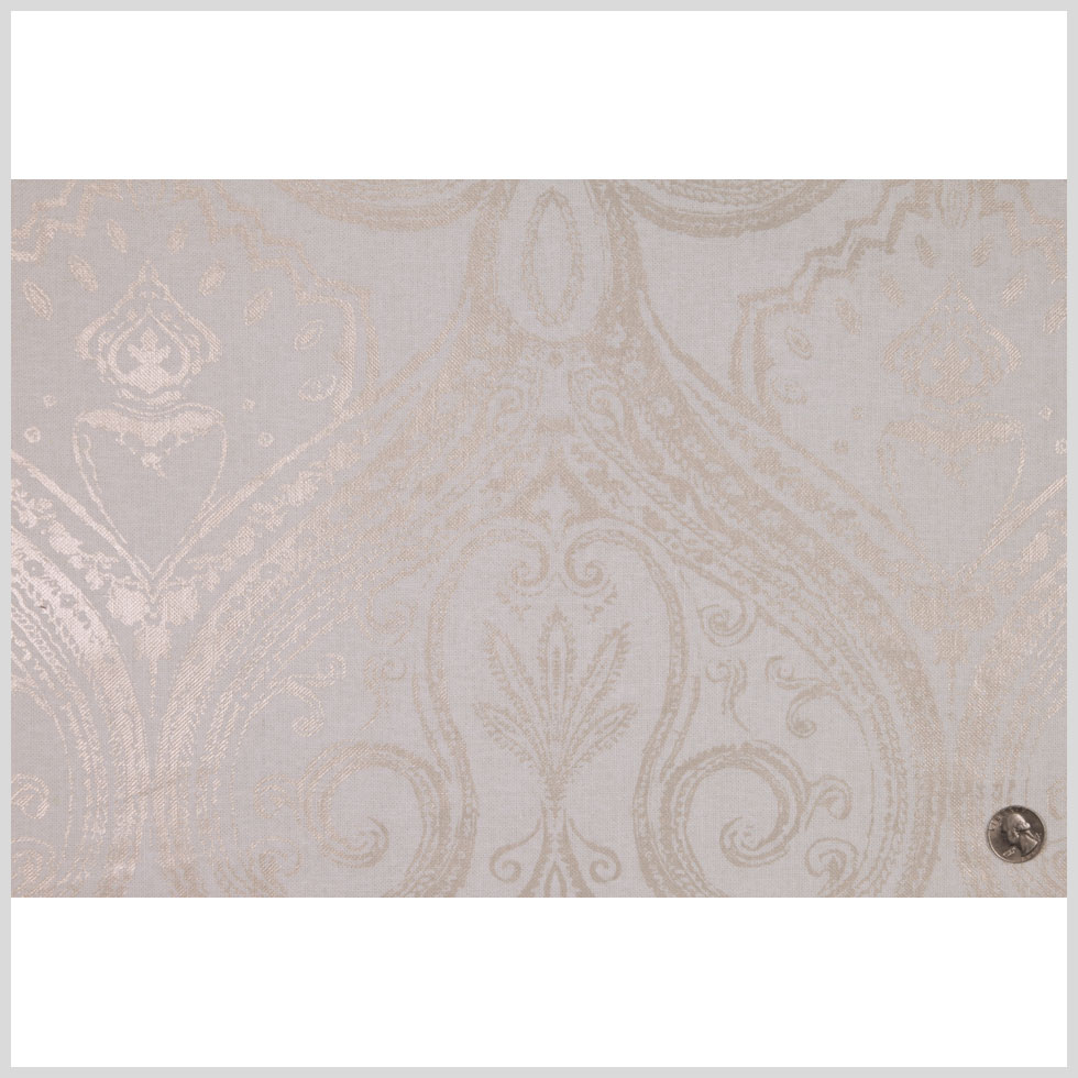 This is a medium weight polyester canvas with a printed metallic damask pattern.