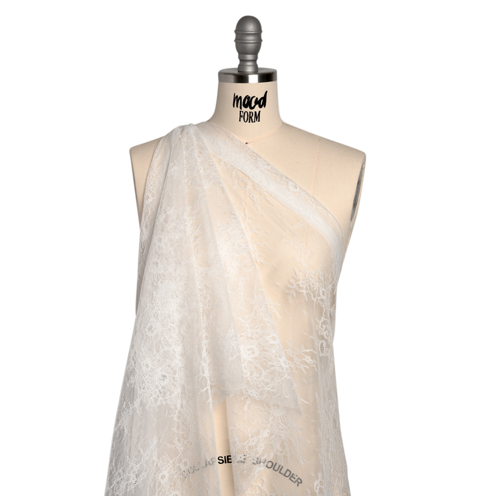 Crisp and softly textured, this Floral Bunches Chantilly Lace provides a simply elegant pattern and a fluttering drape to summer projects and bridal attire alike.Suggested Projects: Bridal Wear, Gowns, Dresses, Blouses, LingerieContent: 100% NylonStretch: Slight Mechanical GiveOpacity: SheerAs if escaping from the densely populated confines of the borders, bunches of blooms populate the net-like ground in the center of this lace. The selvages can be cut off to reveal a scalloped edge that’s perfect for easy hems and sleeves. Chantilly lace features a design with a subtle outline, slightly raised above the surface, adding a touch more texture. With its supple, lightweight drape and cool feel, it’s perfect for bridal gowns, lacy blouses, and so much more! As this fabric is entirely sheer, a lining or solid fabric may be necessary for opacity, depending on your project.Please Note: This lace is produced in three-yard increments. Any orders for more than three yards will be filled in multiple cuts.