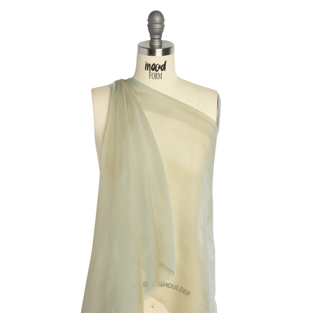 Let this Adelaide Gray and Tan Iridescent Chiffon-Like Silk Voile inspire fresh styles and silhouettes. A sage and beige fabric displays its soft and sleek face, inspiring dimensional garments for formal events. Fluid in drape and light in weight, this sheer fabric romanticizes every silhouette—imagine bridesmaid dresses, heavenly skirts, luxurious blouses, and scarves. We suggest pairing it with a silk lining for an added boost of elegance! A tip from our sewists: this slippery fabric becomes less daunting to sew when using pattern weights, sharp rotary blades, sharp needles, silk pins, and French seams. Get stitching!