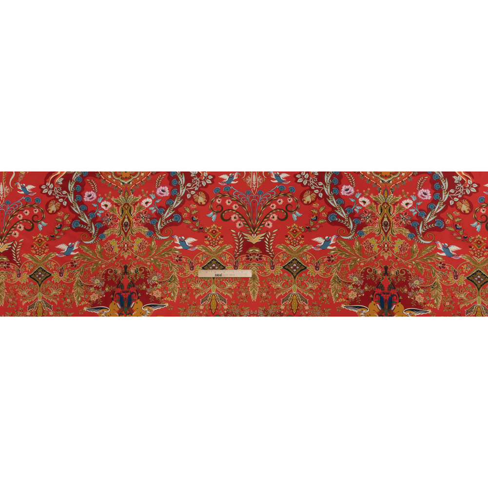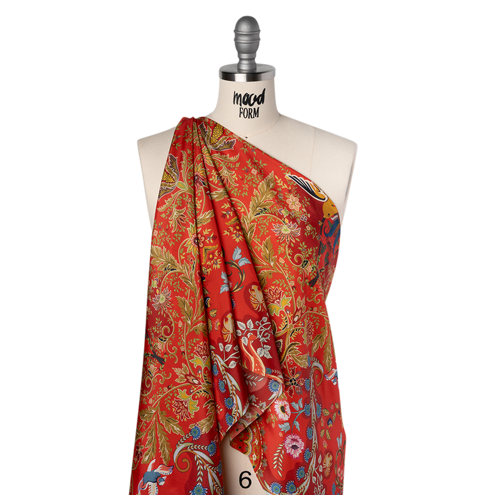 Let the luxury of this Flowers and Crests China Silk/Silk Habotai Print flow over your form—featuring a sleek hand and fluid drape.Suggested Projects: Blouses, Skirts, Dresses, LingerieContent: 100% SilkStretch: NoneOpacity: Slightly TranslucentOrnate flowers and crests unfurl in red, green, golden yellow, and blue against a red backdrop, bringing regal beauty to every glance. China Silk, also known as Habotai, is a lightweight delicacy, often used as a lining to elevate sophisticated garments. Its sleek hand and flowing drape lend themselves to other eveningwear projects as well; envision your nights draped in cowl-neck dresses, breathable button ups, and even luxurious lingerie! A tip from our sewists: this slippery fabric becomes less daunting to sew when using pattern weights, sharp rotary blades, sharp needles, silk pins, and French seams. Get stitching!