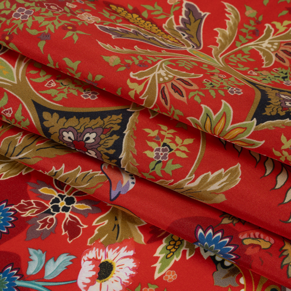 China Silk/Silk Habotai Print Made in Italy - Red, Green and Golden Yellow Flowers and Crests - Deadstock