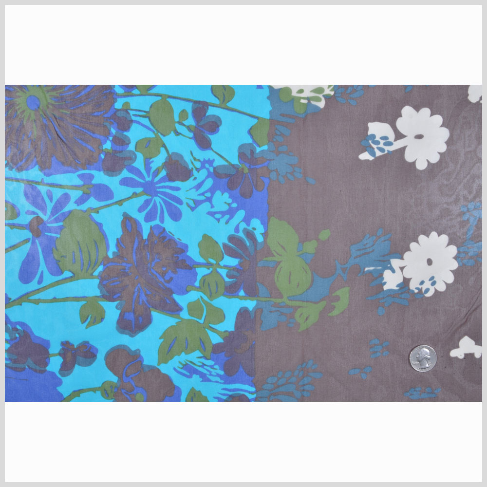 A tame chocolate and bone-colored motif is matched with a whimsical turquoise floral on silk chiffon. Gorgeous and unique, this lightweight fabric would make a fabulous dress or blouse.