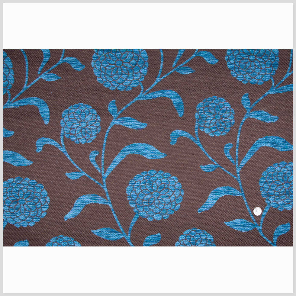 This is a synthetic blend, reversible, blue, floral print chenille with a chocolate brown colored base. Great for funky Upholstery.