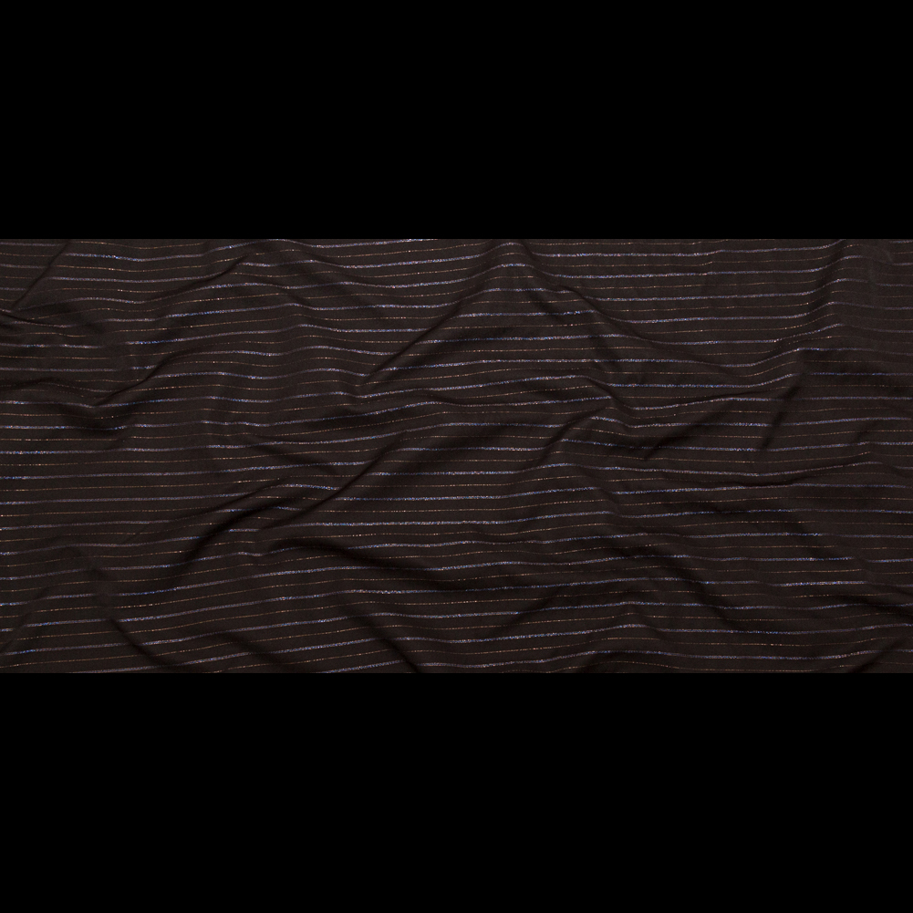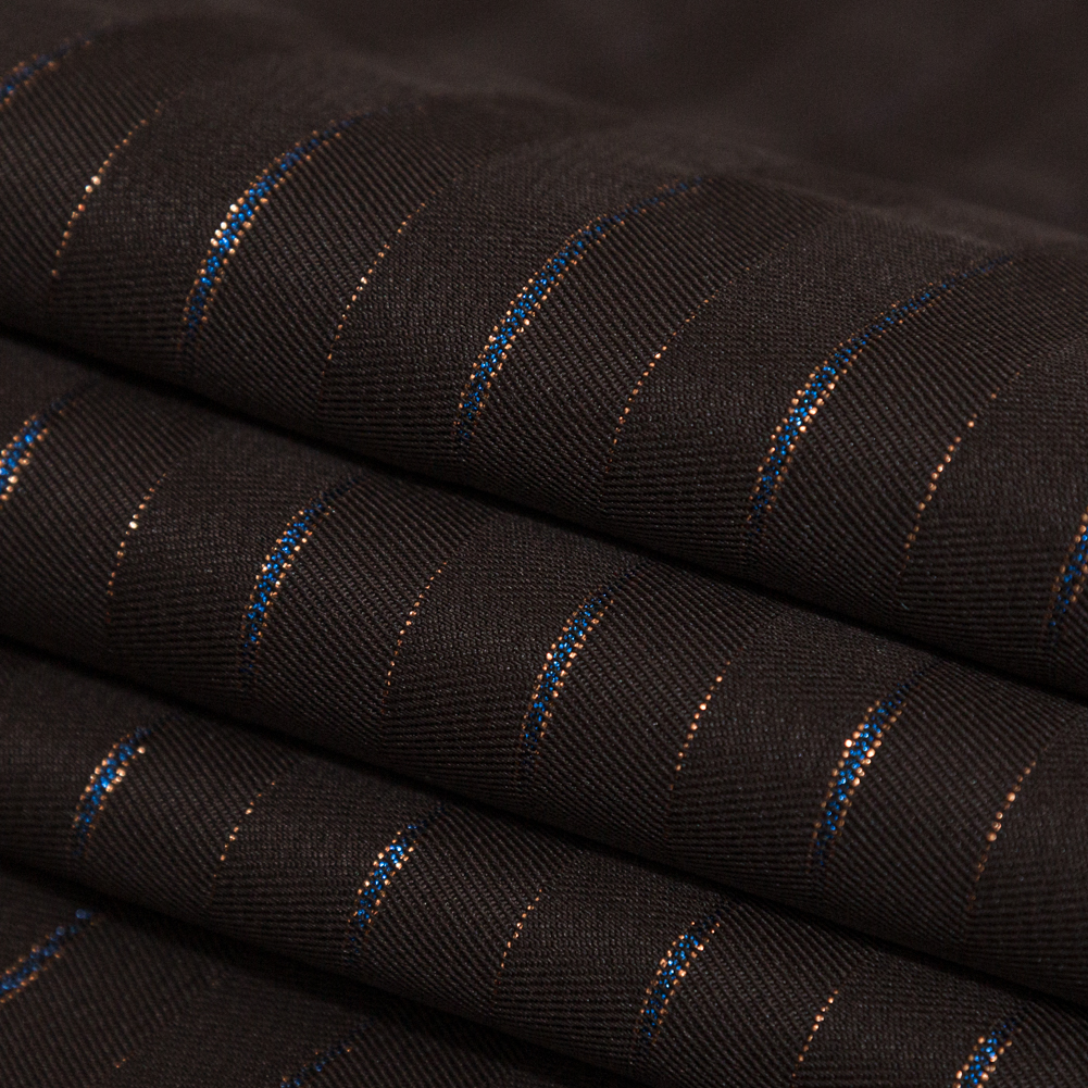 Whether you need a pick-me-up or live your life to the fullest, Mood’s Chocolate Brown Polyester Twill with Metallic Gilded Pleasure and Moody Blue Stripes is sure to spark your spirit with its luminous face and striking colors.