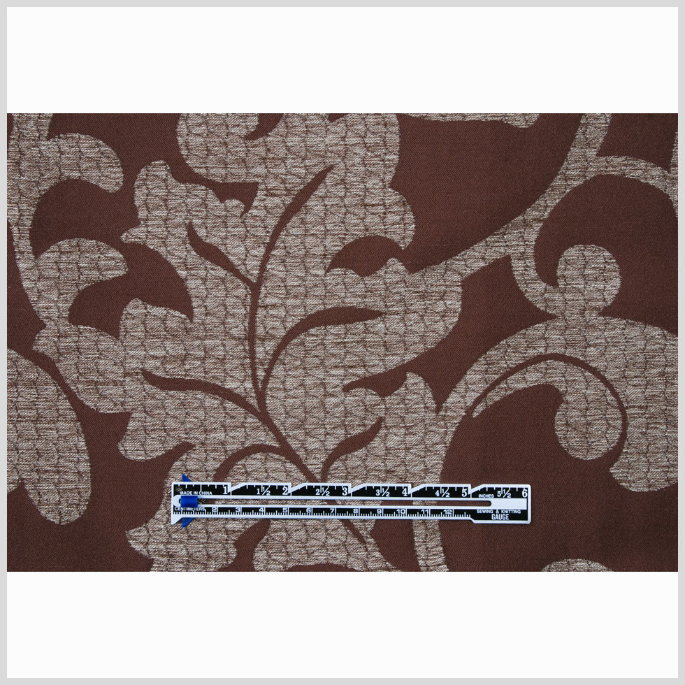 Wow. This floral poly has got color, scale, texture, and personality. A large-scale damask pattern that feels like quilting stands at the center of this medium-weight fabric. The chocolate-colored pattern sits atop mocha and metallic silver threads. Appropriate for a slew of applications, drapery and light upholstery would best display this show-stopping poly.