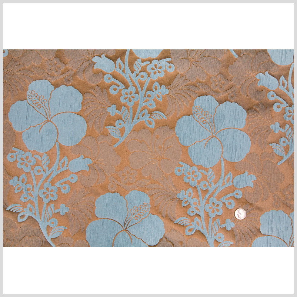 This is a polyester high relief floral brocade in iridescent chocolate brown and duck egg blue. Medium weight, good for drapes.