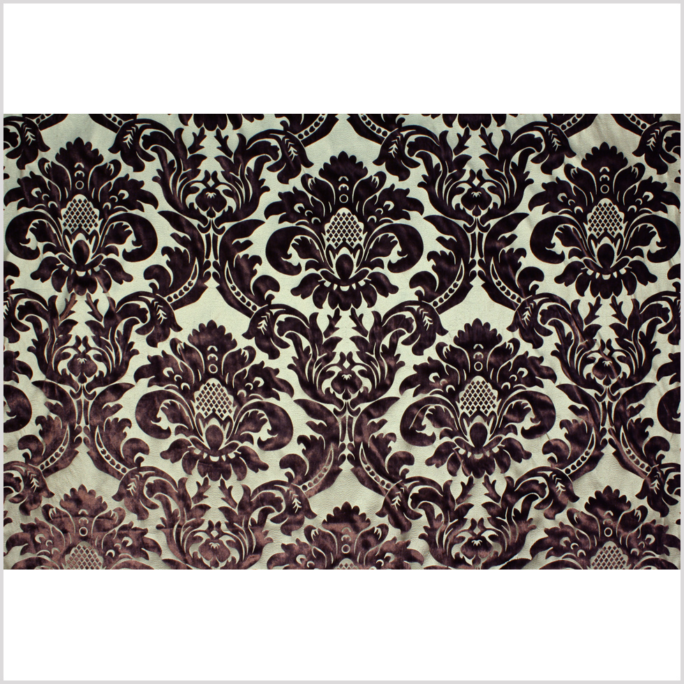This is a cream silk velvet with a chocolate brown print creating the negative space of a beautiful classical floral pattern. Light weight, great for drapery.