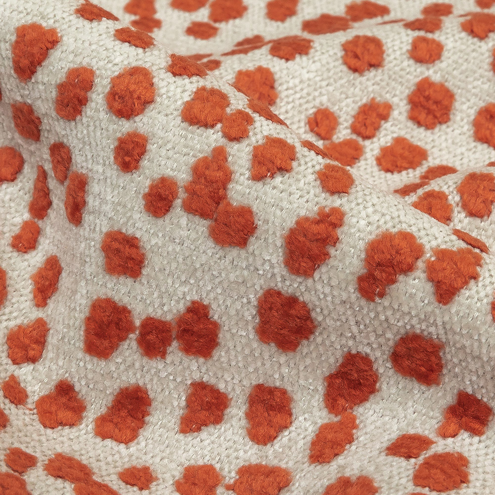 Imagine waking up to the smell of warm cinnamon rolls, and greeting the morning with this Cinnabar Raised Spots Acrylic Chenille Woven! Bright orange chenille fibers form fluffy, cloud-like spots across a woven off-white ground. Undeniably soft and tactile, this heavy, pliable woven is ideal for upholstery. Try accent ottomans or stools, or create your own statement headboard. Structural and of a heavy weight, a backing can be added for certain projects but isn't fully necessary.