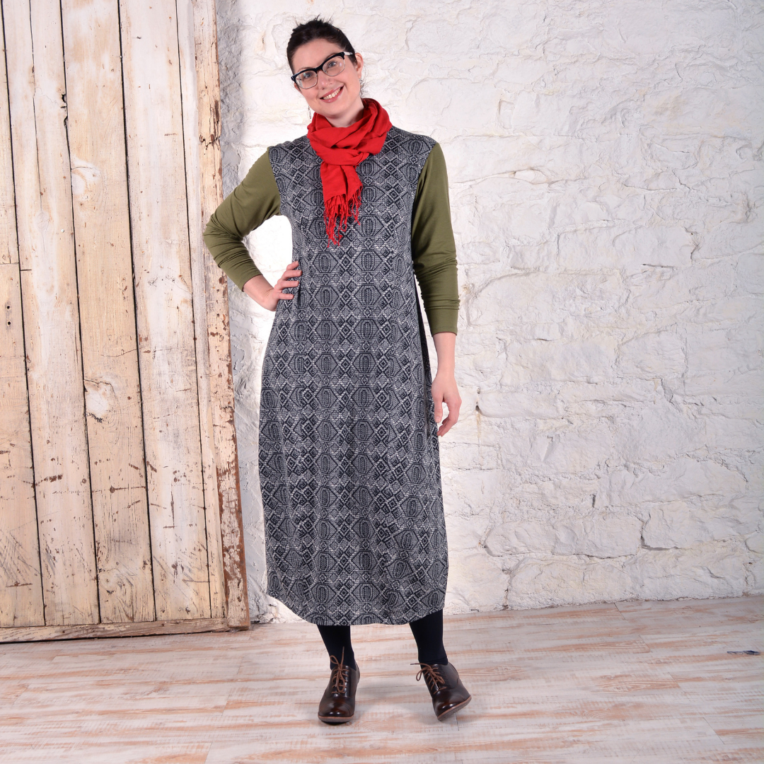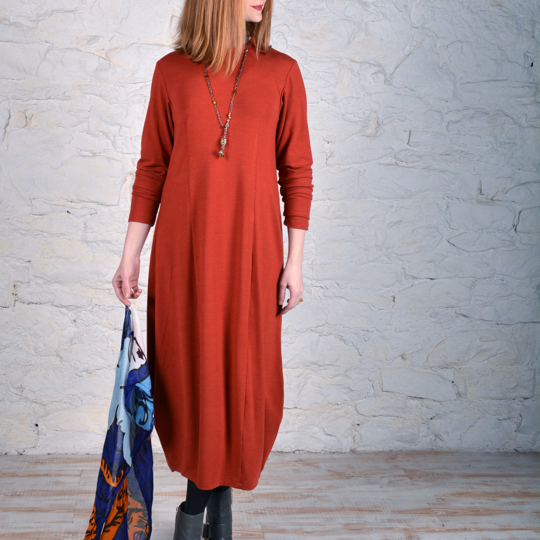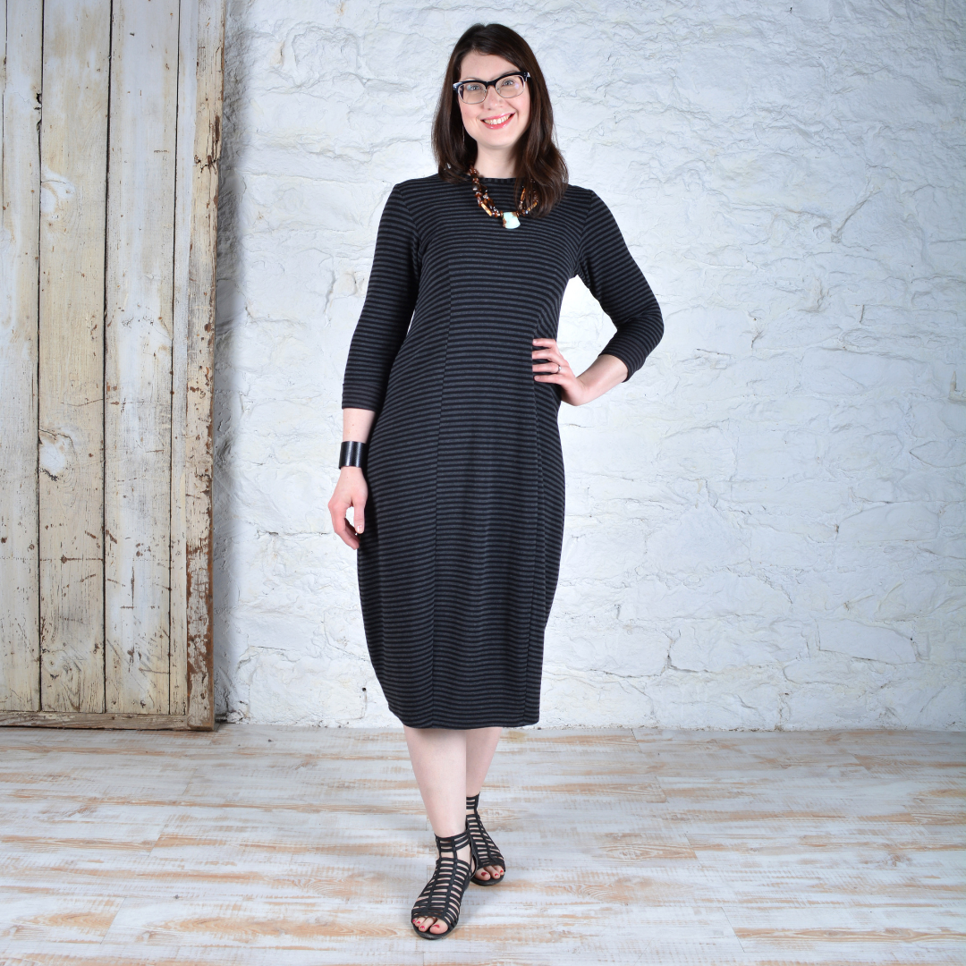 Cityscapes Dress Semi-fitted, long-sleeve dress has extended darts creating a bell shape and tapered midi length hemline.