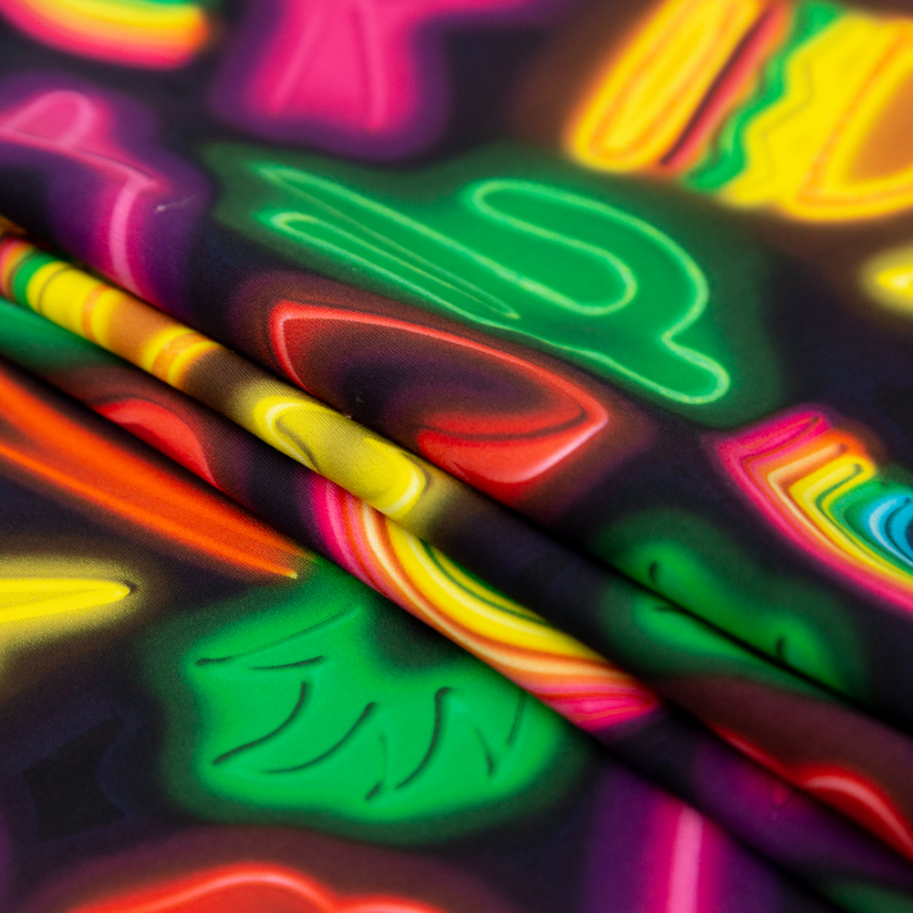 Whether you need one or you don't, our Neon and Black Emojis UV Protective Compression Swimwear Tricot with Aloe Vera Microcapsules is quite the miracle burger! Comprised with a combination of polyester super microfibers and lycra, here is a Max-Dri performance tricot providing a phenomenal 4-way stretch along with superb retention capabilities. Not only is this tricot supreme for articles of active wear such as leggings and shorts due to its high compression fabric structure improving athletic performance, but it is also a brilliant option for bathing suits as it comes complete with 50+ UV protection and Aloe Vera Microcapsules for skin hydration. Also keep in mind that this material undergoes Antibacterial treatment which prevents stains and accruing bad odor. Note: Do not machine wash, tumble dry, iron, bleach, or dry clean this material. Hand washing is recommended. This material weighs 290gsm. Please Note: The dye lot of this fabric has changed as of November 2024. If you had previously ordered this material, please order a swatch to ensure the new dye lot meets your color requirements.