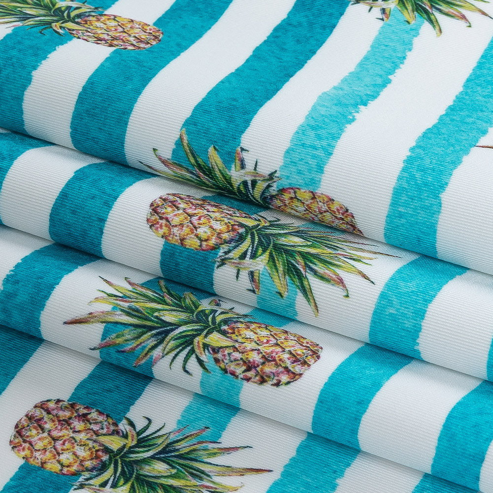 Embrace the beachy vibes of this Blue and White Painted Stripes and Pineapples UV Protective Compression Swimwear Tricot with Aloe Vera Microcapsules, with its sunny pineapples dancing over blue and white stripes! Comprised with a combination of polyester super microfibers and lycra, here is a Max-Dri performance tricot providing a phenomenal 4-way stretch along with superb retention capabilities. Not only is this tricot supreme for articles of activewear such as leggings and shorts due to its high compression fabric structure improving athletic performance, but it is also a brilliant option for bathing suits as it comes complete with 50+ UV protection and Aloe Vera Microcapsules for skin hydration. Also, keep in mind that this material undergoes Antibacterial treatment which prevents stains and accruing bad odor. Note: Do not machine wash, tumble dry, iron, bleach, or dry clean this material. Hand washing is recommended. This material weighs 290gsm.