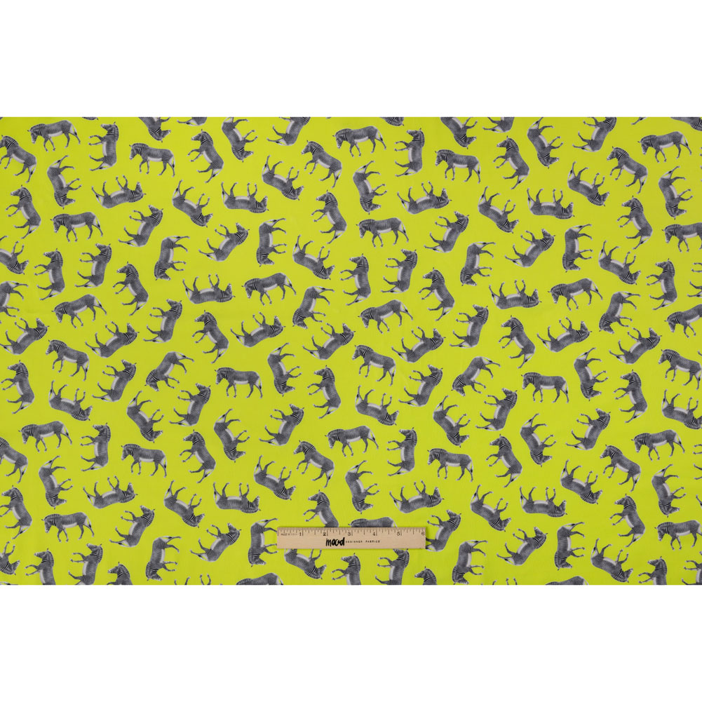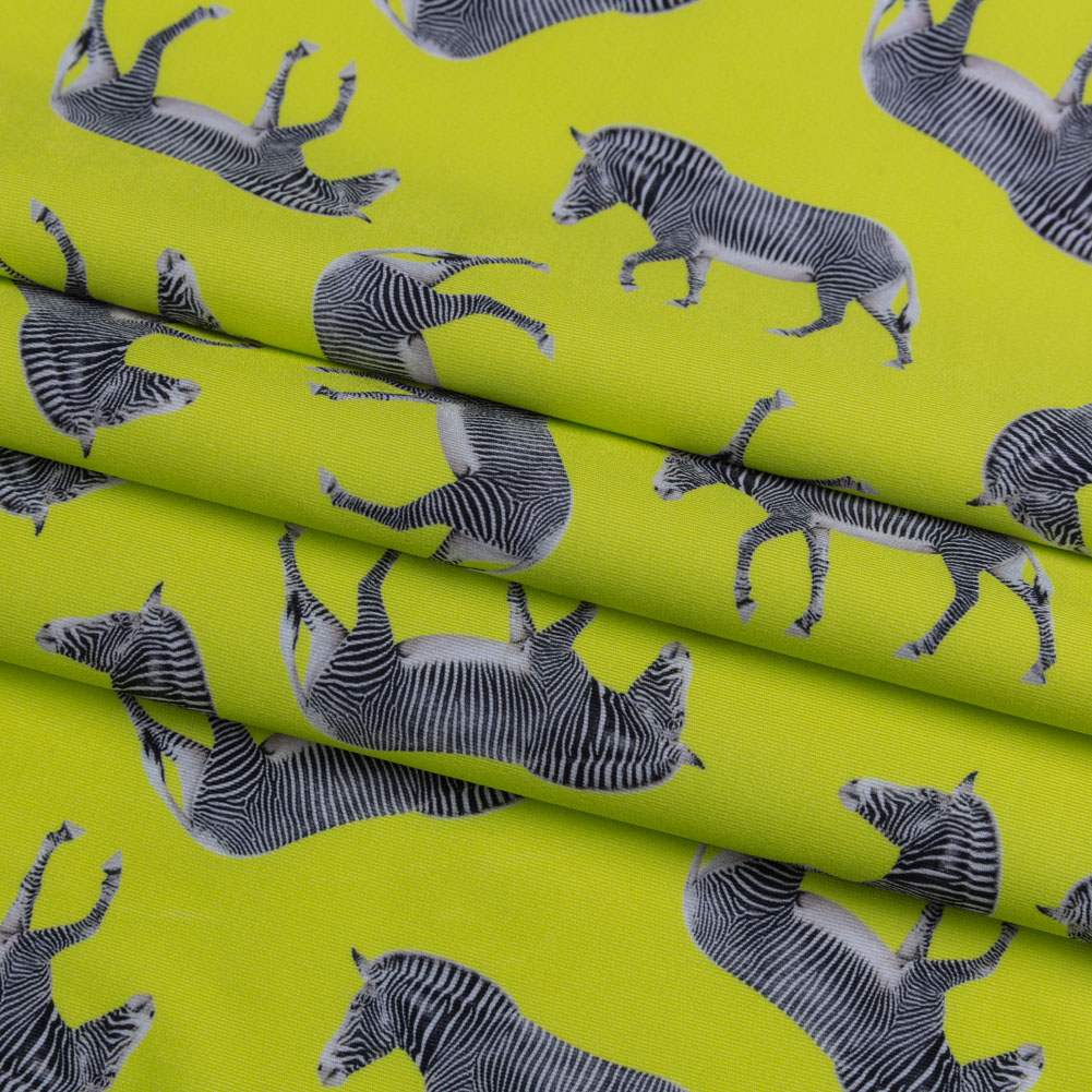 Summer is the time to step out of your comfort zone and have some fun—let this Zebras Printed on a Caye Neon Lemon UV Protective Compression Swimwear Tricot with Aloe Vera Microcapsules lead the way! A rave of zebras dances across a neon-yellow background.