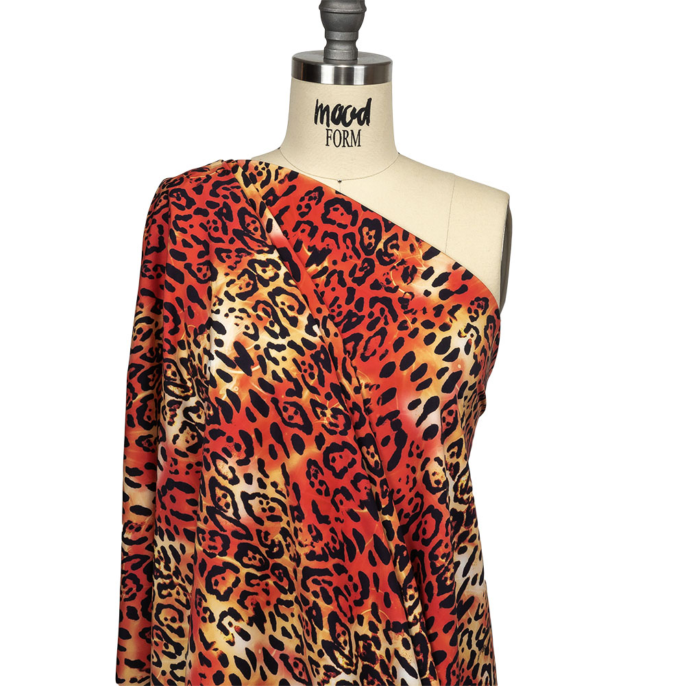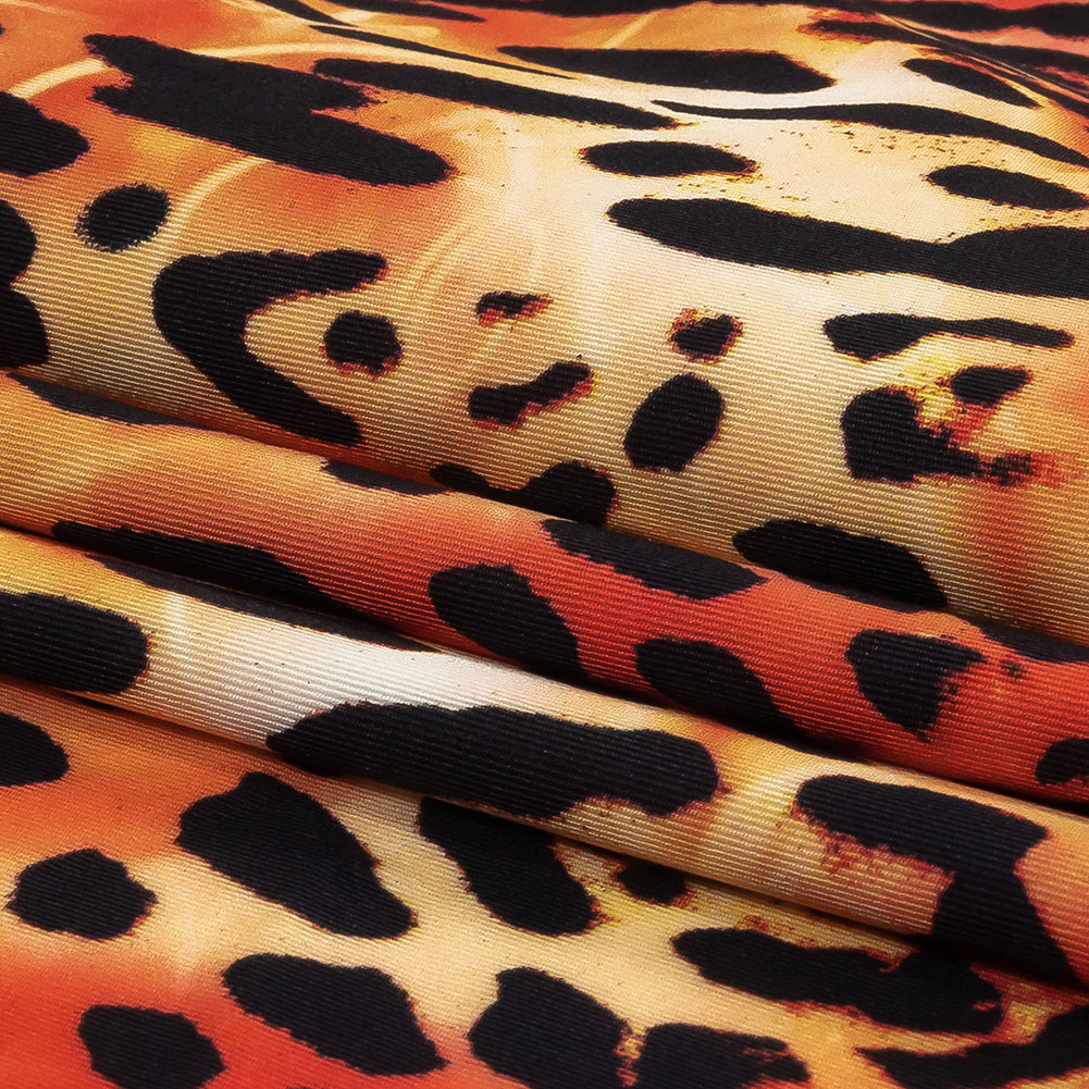 Fuse free-spirited and funky aesthetics with our Orange and Yellow Tie Dye Leopard UV Protective Compression Swimwear Tricot with Aloe Vera Microcapsules! Bold leopard spots race over a mesmerizing orange and yellow tie-dye backdrop. Composed of a combination of polyester super microfibers and lycra, here is a Max-Dri performance tricot providing a phenomenal 4-way stretch along with superb retention capabilities. Not only is this tricot supreme for articles of activewear such as leggings and shorts due to its high compression fabric structure improving athletic performance, but it is also a brilliant option for bathing suits as it comes complete with 50+ UV protection and Aloe Vera Microcapsules for skin hydration. Also, keep in mind that this material undergoes Antibacterial treatment which prevents stains and accruing bad odor.Note: Do not machine wash, tumble dry, iron, bleach, or dry clean this material. Hand washing is recommended. This material weighs 290gsm.