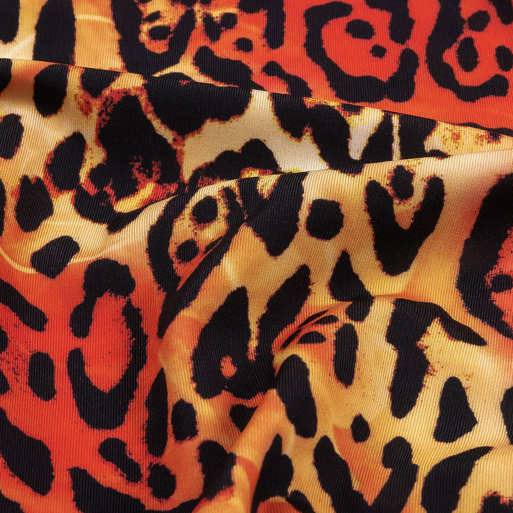 Fuse free-spirited and funky aesthetics with our Orange and Yellow Tie Dye Leopard UV Protective Compression Swimwear Tricot with Aloe Vera Microcapsules! Bold leopard spots race over a mesmerizing orange and yellow tie-dye backdrop.