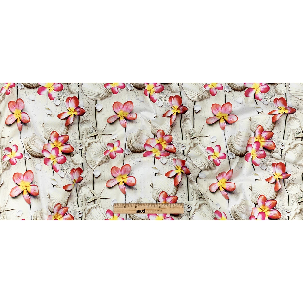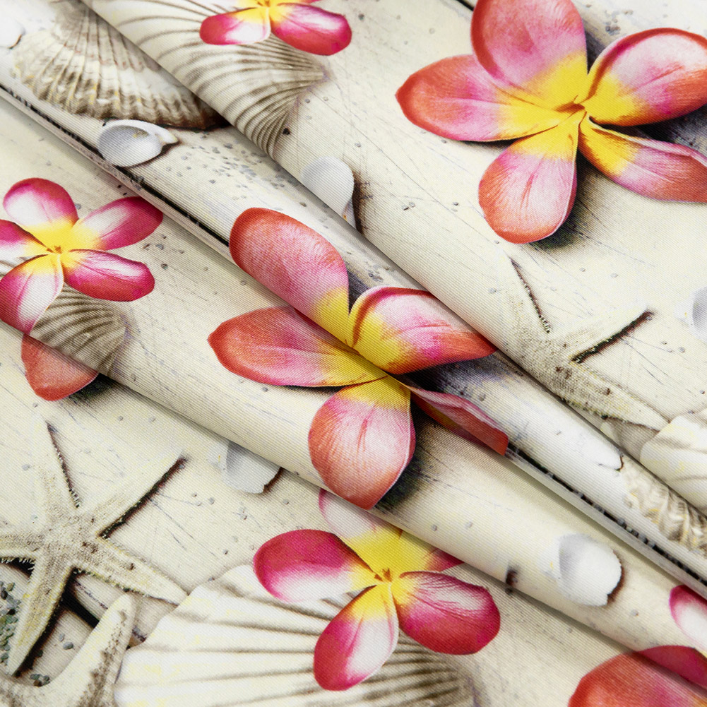 Bask in the summer sun beaming down on you and this Shells on a Beige Boardwalk UV Protective Compression Swimwear Tricot with Aloe Vera Microcapsules. Comprised with a combination of polyester super microfibers and lycra, here is a Max-Dri performance tricot providing a phenomenal 4-way stretch along with superb retention capabilities. Not only is this tricot supreme for articles of activewear such as leggings and shorts due to its high compression fabric structure improving athletic performance, but it is also a brilliant option for bathing suits as it comes complete with 50+ UV protection and Aloe Vera Microcapsules for skin hydration. Also keep in mind that this material undergoes Antibacterial treatment which prevents stains and accruing bad odor. Note: Do not machine wash, tumble dry, iron, bleach, or dry clean this material. Hand washing is recommended. This material weighs 290gsm.
