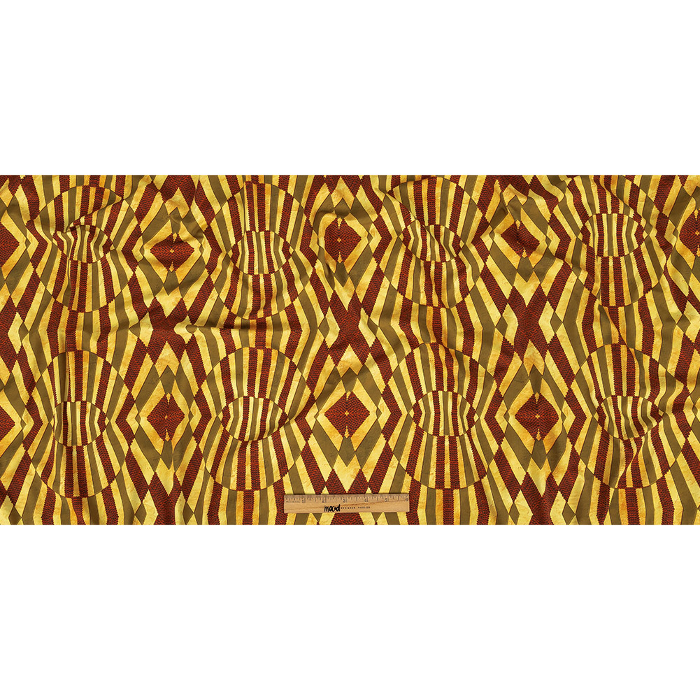 Our Yellow, Olive and Mahogany Geometric UV Protective Compression Swimwear Tricot with Aloe Vera Microcapsules is just wild enough to be at home on the savannah! Comprised with a combination of polyester super microfibers and lycra, here is a Max-Dri performance tricot providing a phenomenal 4-way stretch along with superb retention capabilities. Not only is this tricot supreme for articles of activewear such as leggings and shorts due to its high compression fabric structure improving athletic performance, but it is also a brilliant option for bathing suits as it comes complete with 50+ UV protection and Aloe Vera Microcapsules for skin hydration. Also, keep in mind that this material undergoes Antibacterial treatment which prevents stains and accruing bad odor. Note: Do not machine wash, tumble dry, iron, bleach, or dry clean this material. Hand washing is recommended. This material weighs 290gsm.