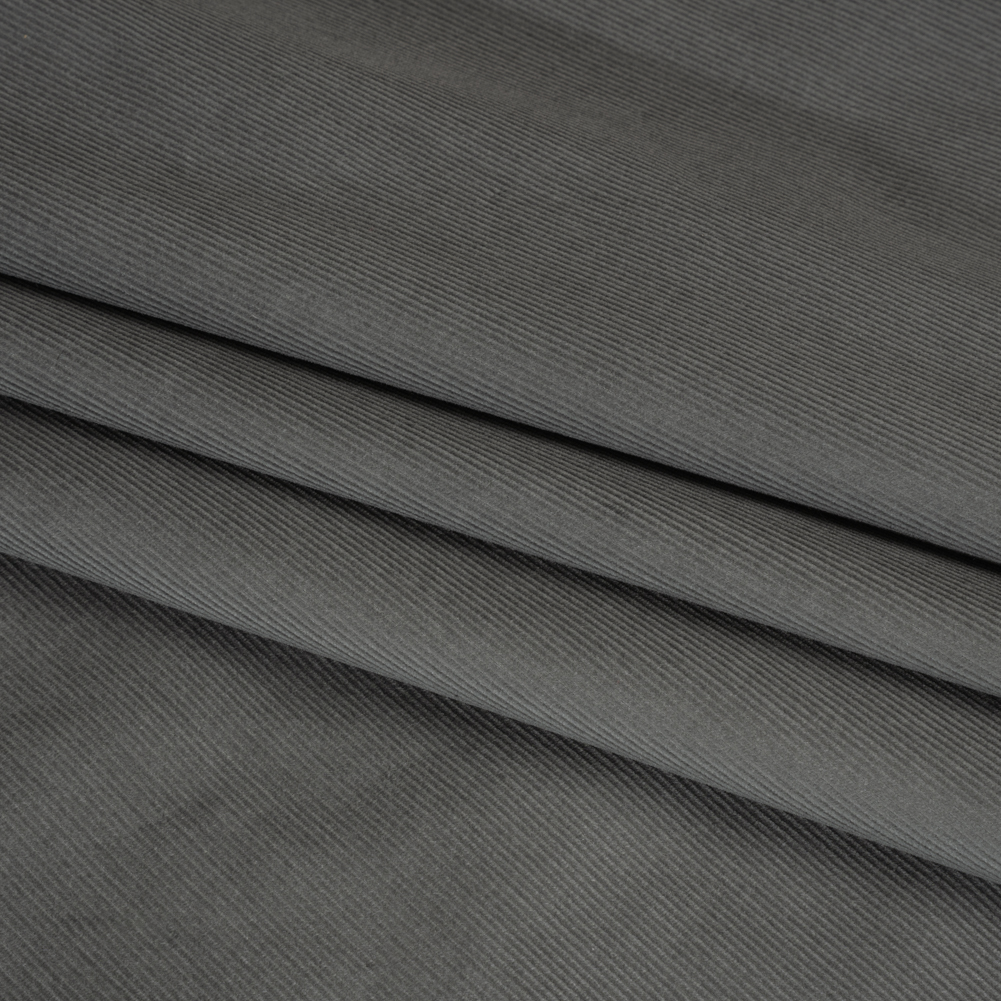 Step into the dark academia world of pinot noir, Plato, and Latin professors in this Gray Cobble Coolmax Poly Cotton Corduroy. Thin and lightweight, with moisture-wicking properties, it’s the perfect companion for atmospheric literary adventures.Suggested Projects: Pants, Jackets, Dresses, SkirtsContent: 70% Cotton, 28% Polyester, 2% LycraStretch: NoneOpacity: OpaqueIn storm gray, this corduroy brings to mind dark nights in a drafty manor spent with a book, cozy and warm in front of a fire. Thin and lightweight, this particular fabric also boasts moisture wicking properties, helping you remain toasty yet dry. Now, you may be familiar with the classic ribbed texture of corduroy—created when extra filling yarn is weaved into the base fabric. With 17 wales per inch, this specific corduroy has a smoother, softer hand than the average of this textile. Its stiff drape lending itself well to tailored designs, we envision retro buttoned shirts, straight-leg trousers and simple dresses that are sure to be as durable as they are comfortable. Though opaque, a lining may be added for comfort and extra warmth.