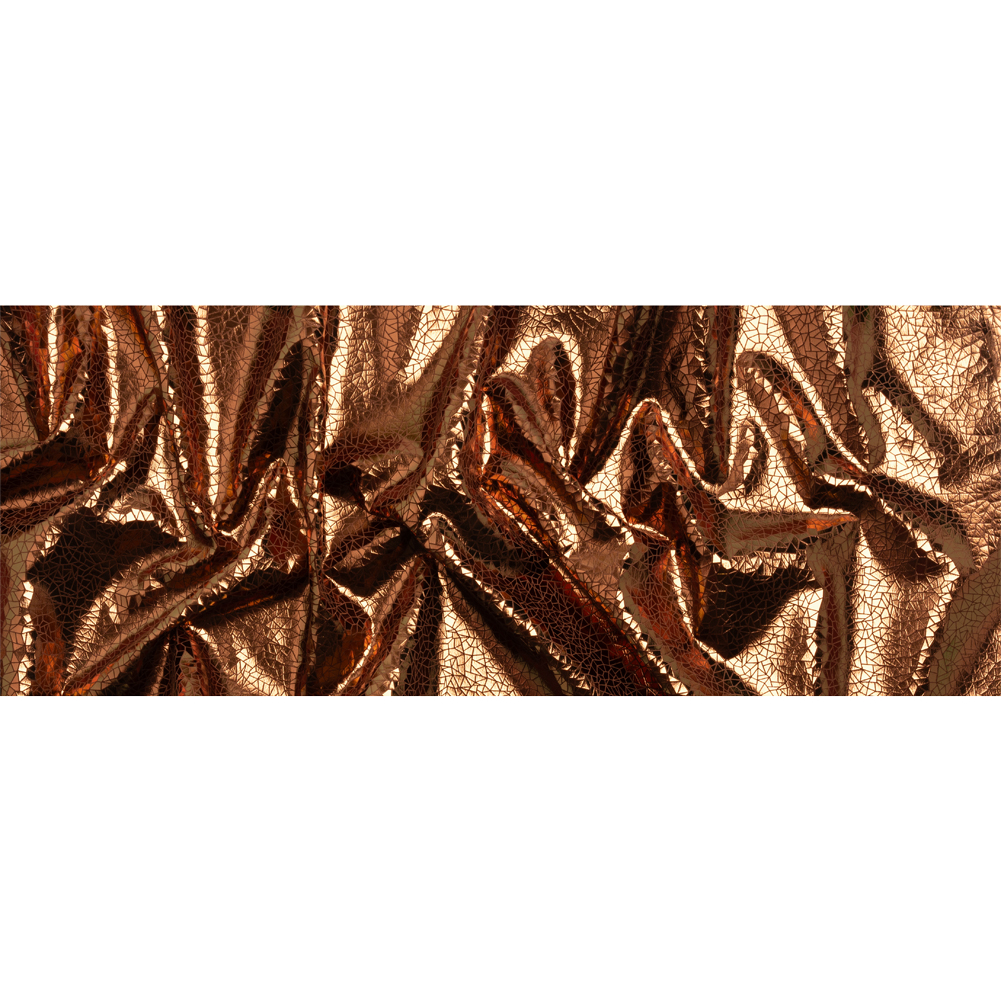 Create conversation pieces from this Copper Geometric Crackle Metallic Foiled Chenille! A metallic copper surface cracks like ice to reveal the plush texture of its brown chenille background, backed by a pebbly hand. Shimmering like starlight, it is relatively lightweight, featuring a semi-structured drape that invites exploration down glamorous avenues. From bar stool covers to headboards, this reflective material steals the spotlight as the main attraction in every room.