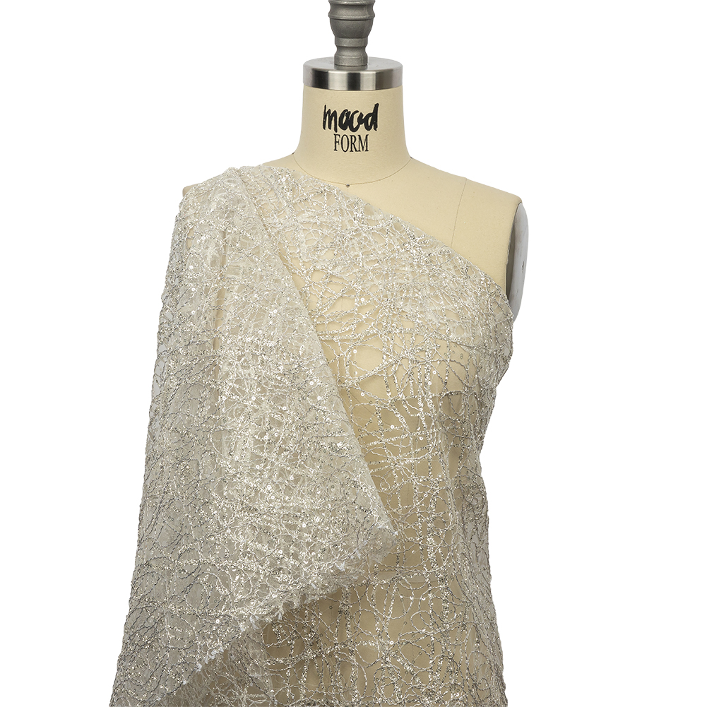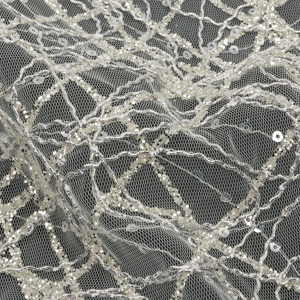 Corded Glitter Tulle with Sequins – White and Metallic Silver Abstract
