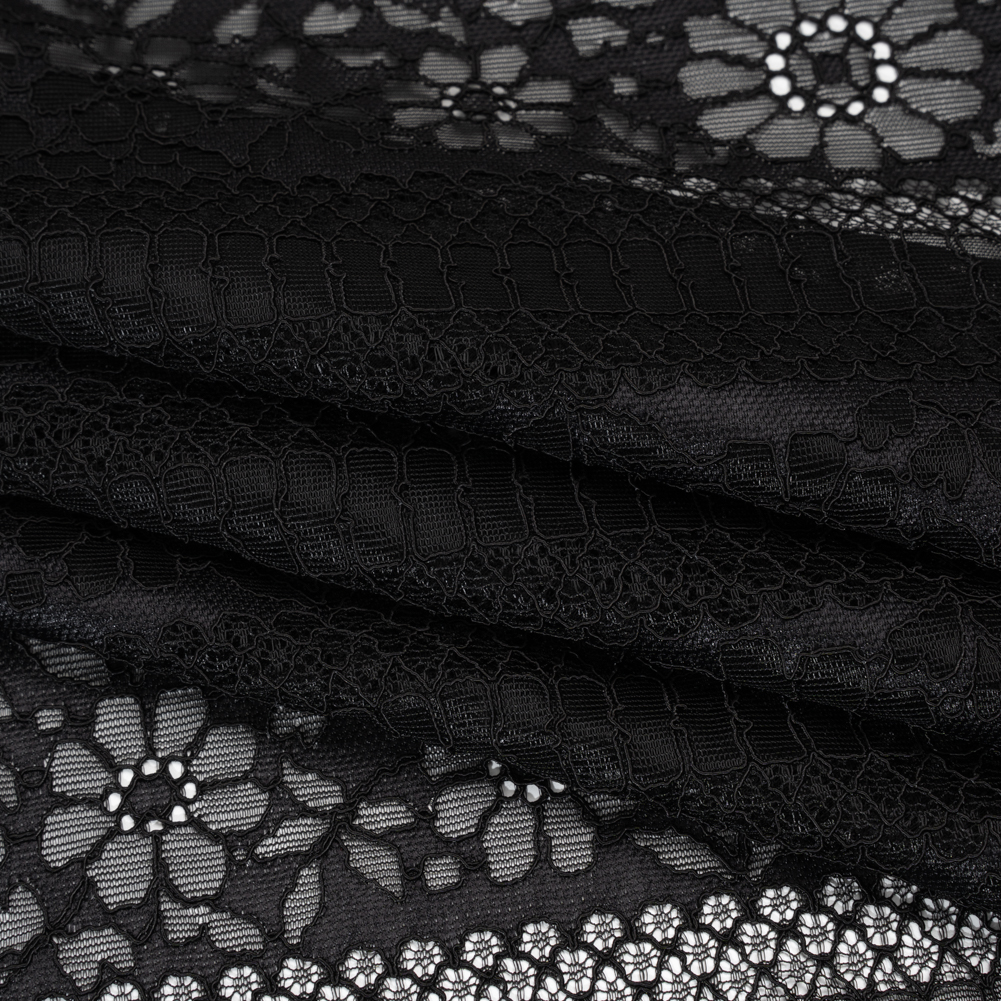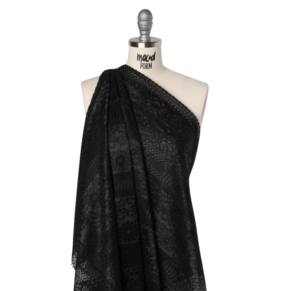 Architectural romance takes center stage in this Black Floral and Geometric Stripes Corded Lace with Eyelash Fringe Edges, where contrast and texture intertwine in striking detail.Suggested Projects: Dresses, Skirts, Blouses, LingerieContent: 35% Nylon, 35% Rayon, 30% PolyesterStretch: NoneOpacity: SheerFloral motifs and linear stripes create a dynamic interplay of softness and structure, all enhanced by subtle cording and delicate eyelash fringe edges. With a crisp hand and flowing drape, this lace is ideal for sheer panel dresses, dramatic sleeves, or divine lingerie. A lining or underlayer lets the lace’s dimensional pattern stand out while offering coverage where needed.