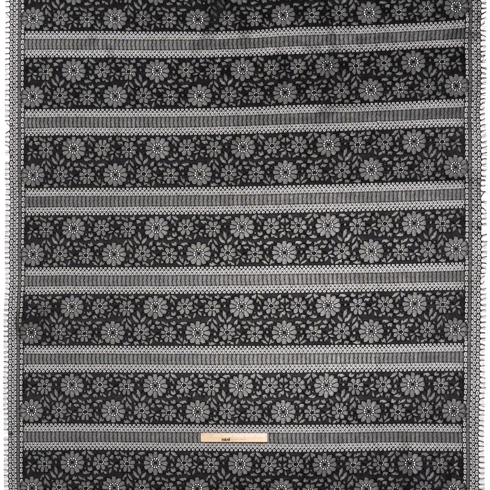 Architectural romance takes center stage in this Black Floral and Geometric Stripes Corded Lace with Eyelash Fringe Edges, where contrast and texture intertwine in striking detail.