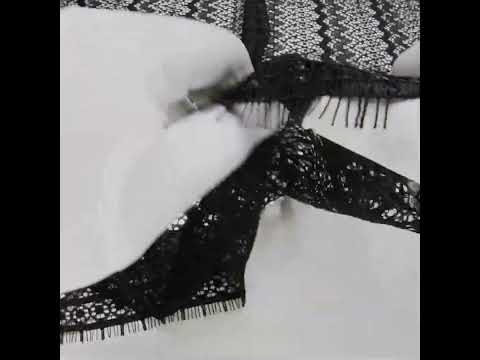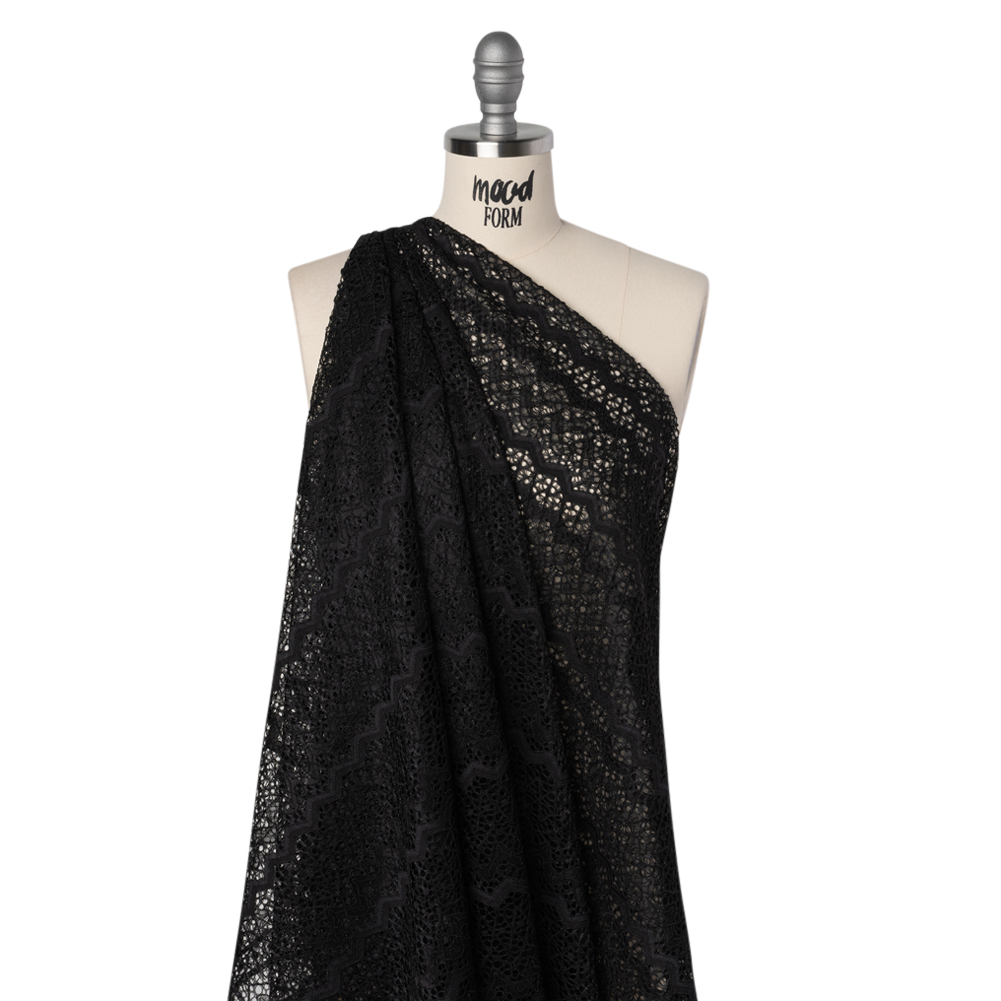Give your look a graphic touch with this Black Zig Zag Stripes Corded Lace with Eyelash Fringe Edges, where bold geometry meets sheer elegance.Suggested Projects: Dresses, Skirts, Blouses, LingerieContent: 55% Nylon, 35% Rayon, 10% PolyesterStretch: NoneOpacity: SheerThe zigzag stripe design is outlined with soft cording, adding subtle texture and dimension to its openwork ground, while the eyelash fringe edges offer a graceful, organic finish. With its crisp hand and fluttery drape, this lace is perfect for overlay skirts, illusion necklines, unlined sleeves, or lingerie with an architectural twist. Use a lining or underlayer for coverage and contrast, or let its transparency highlight layered textures and shapes.