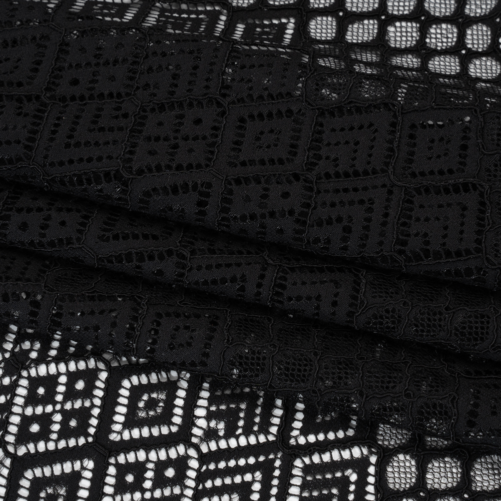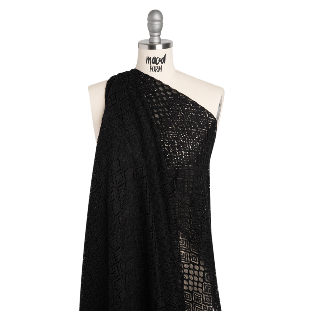 Rest your soul shrouded in this Black Decorated Diamond Stripes Corded Lace with Finished Edges—featuring a soft, slightly tactile hand and fluid drape.Suggested Projects: Shirts, Skirts, Dresses, LingerieContent: 45% Nylon, 35% Rayon, 20% CottonStretch: Slight Mechanical GiveOpacity: SheerA geometric grid of decorated diamonds covers this black lace in alternating stripes of larger and smaller diamonds. A fluid drape and soft, slightly tactile hand makes it ideal for loose, flowy silhouettes—with a finished edge making completing your projects that much easier. With its geometric design, we envision waterfall skirts, breezy button-up shirts, sheer blouses, lingerie, and more! Sheer, use it as a panel or insert a lining for more opacity.