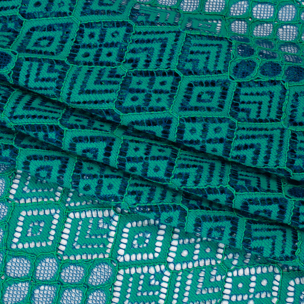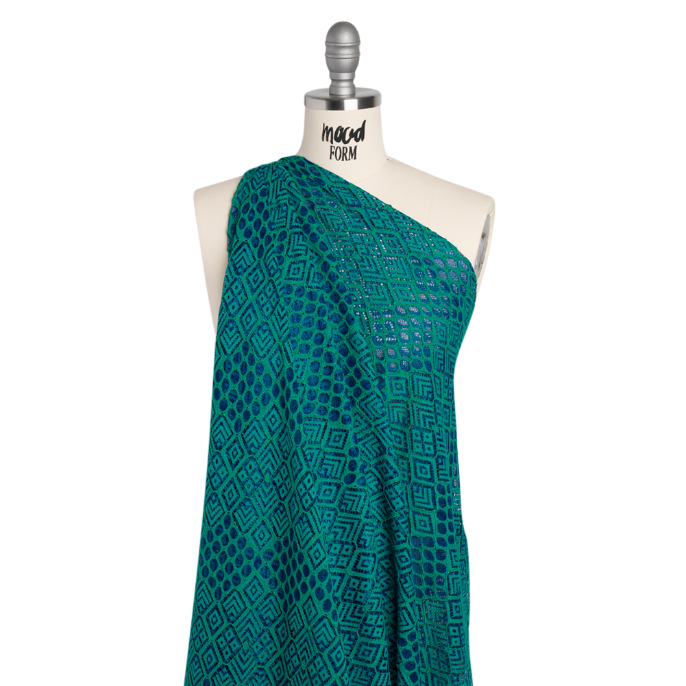 Strut your stuff like a peacock in this Blue and Teal Decorated Diamond Stripes Corded Lace with Finished Edges—featuring a soft, slightly tactile hand and fluid drape.Suggested Projects: Shirts, Skirts, Dresses, LingerieContent: 45% Nylon, 35% Rayon, 20% CottonStretch: Slight Mechanical GiveOpacity: SheerA geometric grid of decorated diamonds covers this blue and teal lace in alternating stripes of larger and smaller diamonds. A fluid drape and soft, slightly tactile hand makes it ideal for loose, flowy silhouettes—with a finished edge making completing your projects that much easier. With its geometric design, we envision waterfall skirts, breezy button-up shirts, sheer blouses, lingerie, and more! Sheer, use it as a panel or insert a lining for more opacity.