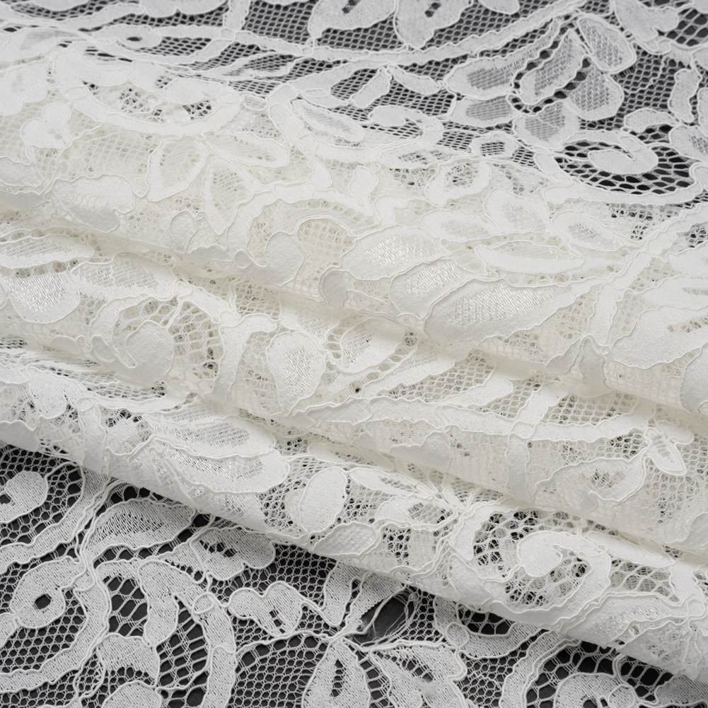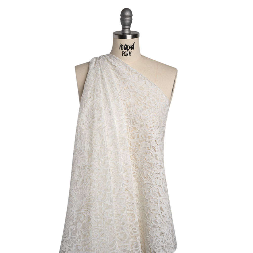 Stitch your storybook outfit with this Ivory Flowering Vines Corded Lace with Finished Edges—featuring a tactile hand and voluminous drape.Suggested Projects: Dresses, Skirts, Blouses, LingerieContent: 45% Cotton, 35% Nylon, 20% RayonStretch: NoneOpacity: SheerVines bloom and climb in graceful arcs across this ivory lace, while finished edges offer a refined ease—bringing your most romantic creations to life with less effort. This particular fabric has a silky feel with a tactile hand—thanks to the thin cords running over the design—and features a voluminous drape. Use this lace to create elegant gowns with long trains, mock-collar blouses to be paired with structured trousers, or some lavish lingerie. Due to the nature of lace, some portions of this fabric are open and it has a sheer opacity overall, so a lining may be desired for opacity.