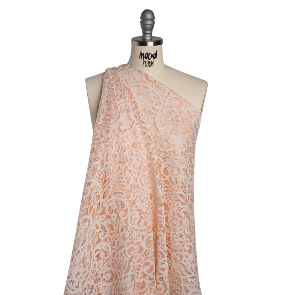 The delicate feel and hue of this Pale Blush and Ivory Flowering Vines Corded Lace with Finished Edges are sure to make you blush—featuring a tactile hand and voluminous drape.Suggested Projects: Dresses, Skirts, Blouses, LingerieContent: 45% Cotton, 35% Nylon, 20% RayonStretch: NoneOpacity: SheerVines bloom and climb in graceful arcs across this pale blush and ivory lace, while finished edges offer a refined ease—bringing your most romantic creations to life with less effort. This particular fabric has a silky feel with a tactile hand—thanks to the thin cords running over the design—and features a voluminous drape. Use this lace to create elegant gowns with long trains, mock-collar blouses to be paired with structured trousers, or some lavish lingerie. Due to the nature of lace, some portions of this fabric are open and it has a sheer opacity overall, so a lining may be desired for opacity.