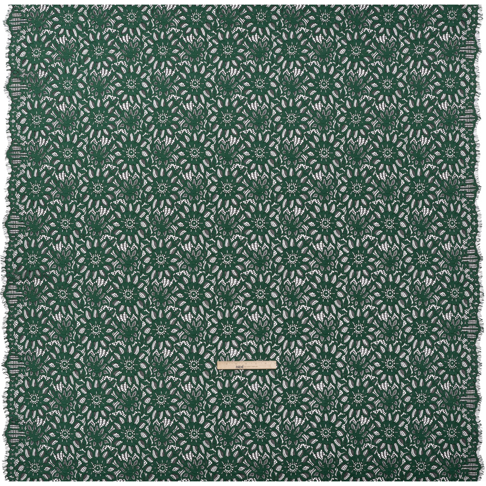 Fae fashions unfurl from this Bay Berry Green and Black Sunflowers Corded Lace with Finished Scalloped Edges—featuring a tactile hand and fluid drape.Suggested Projects: Dresses, Skirts, Blouses, LingerieContent: 28% Nylon 45% Rayon 27% CottonStretch: Mechanical GiveOpacity: SheerLarge sunflowers in a cool green hue bloom atop this black lace, framed by finished scalloped edges for added elegance. With a silky-soft feel and lightly tactile hand—thanks to fine cording tracing the floral design—this lace offers a nearly lightweight, fluid drape while maintaining flexibility. Ideal for graceful gowns with flowing trains, mock-neck blouses, or indulgent lingerie, it brings drama and romance to any look. As with most lace, its open construction means a lining or thoughtful layering may be desired for added coverage. Please note: This is a panel that measures 51” by 50”.