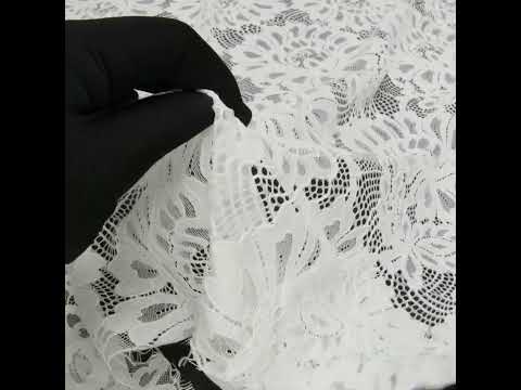 Put on your favorite pearls and this Ivory Bold Florals Corded Lace with Finished Scalloped Edges before stepping out to a truly elegant night of sipping champagne beneath glittering chandeliers—featuring a tactile hand and voluminous drape.Suggested Projects: Dresses, Skirts, Blouses, LingerieContent: 55% Cotton, 45% NylonStretch: NoneOpacity: SheerBig, bold florals bloom in rich romance across this ivory lace, while scalloped finished edges ensure your projects come together with ease and elegance. Featuring a silky feel and a tactile hand—thanks to fine cording tracing the design—this lace offers a voluminous, fluid drape perfect for sweeping silhouettes. Craft elegant gowns with trailing trains, mock-collar blouses to pair with tailored trousers, or decadent lingerie. Naturally sheer, a lining may be desired to add opacity depending on your vision.