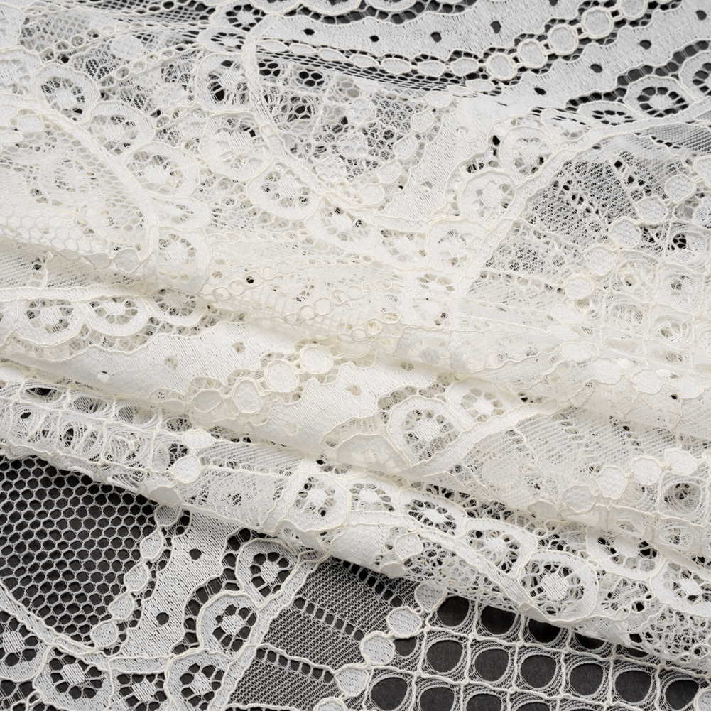 Refined geometry makes a soft statement in this Ivory Geometric Lozenges Corded Lace with Scalloped Fringe Edges, a lace that balances structured design with feminine charm.Suggested Projects: Dresses, Skirts, Blouses, LingerieContent: 55% Nylon, 30% Rayon, 15% PolyesterStretch: NoneOpacity: SheerInterlocking lozenge shapes form a sleek geometric pattern, brought to life with raised cording for added dimension and soft structure. The scalloped fringe edges add an elegant finish, perfect for unhemmed sleeves, tiered skirts, or statement necklines. With its soft hand and airy drape, this sheer lace is ideal for layering over slips or linings to create depth, movement, and visual intrigue in everything from lingerie to gala-ready gowns.