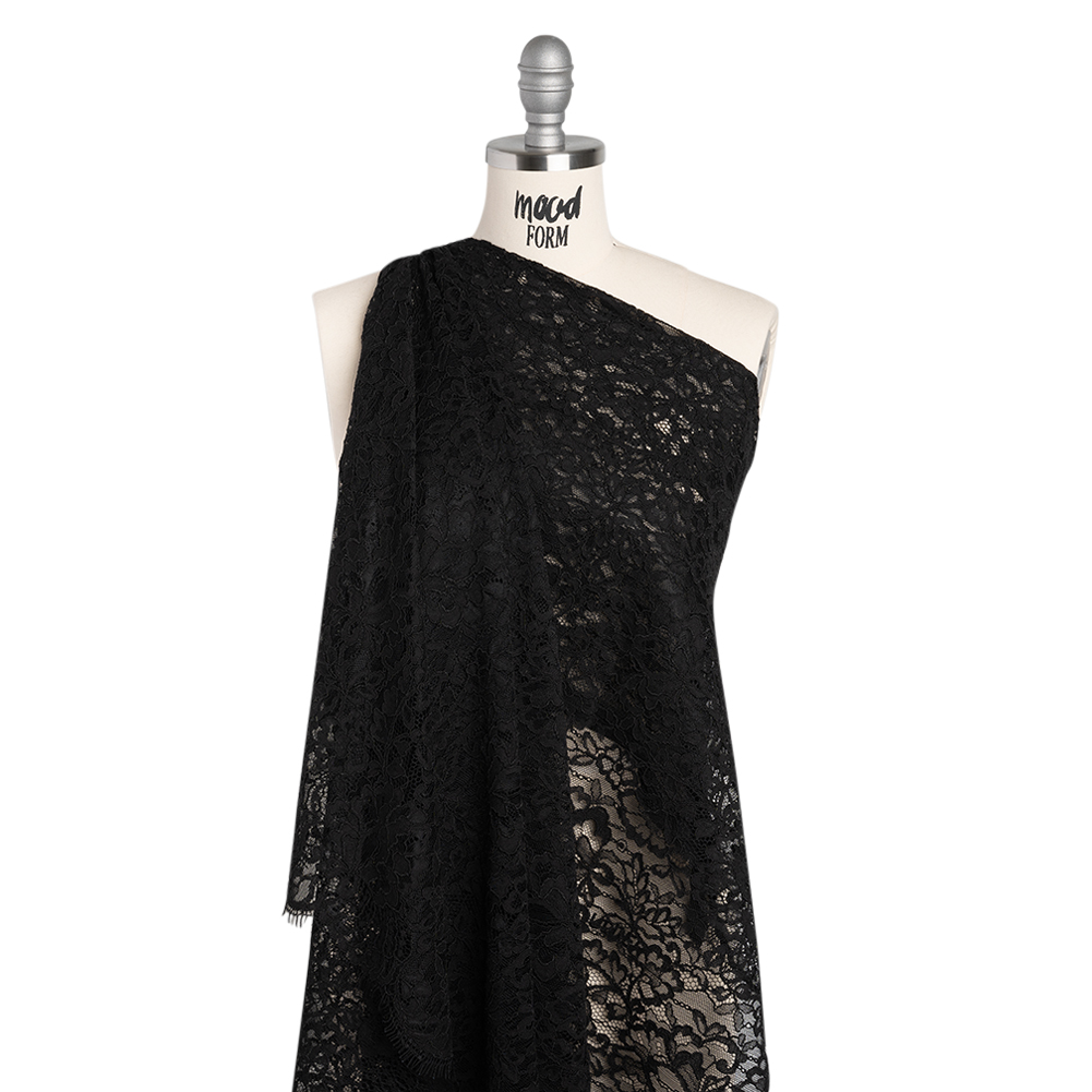 Timeless elegance unfurls from this Black Classic Florals Corded Raschel Lace Panel with Finished Edges—featuring a soft, tactile hand and flexible drape.Suggested Projects: Blouses, Skirts, Dresses, LingerieContent: 54% Rayon 27% Nylon 19% CottonStretch: NoneOpacity: SheerLooping and layered florals climb across this black corded lace panel—with finished, fringed edges completing the delicate design. This particular lace has a soft and tactile hand—thanks to thin cords running over the design—and features a weighted and flexible drape. Use this lace to create elegant gowns with long trains, mock-collar blouses to be paired with structured trousers, or some lavish lingerie. Due to the nature of lace, some portions of this fabric are open so a lining may be desired for opacity. Please Note: This is a panel that measures 41” by 60”.