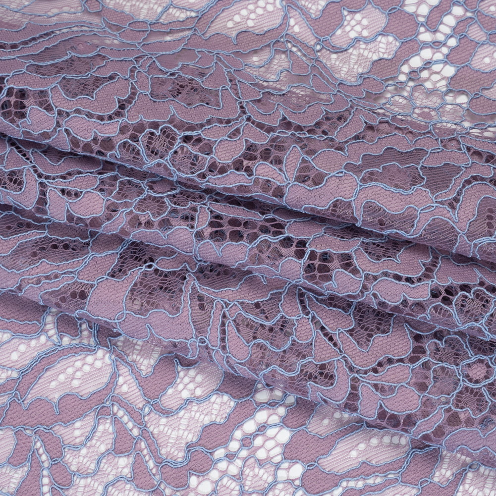 Focus on the little luxuries in life, such as this Lavender and Sky Blue All-Over Flowers and Leaves Corded Raschel Lace Panel with Finished Edges—featuring a sleek, tactile hand and fluid drape.