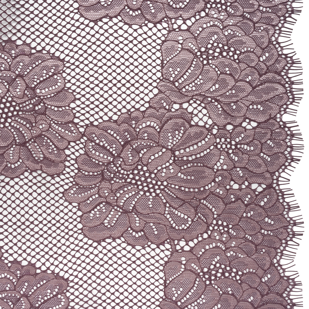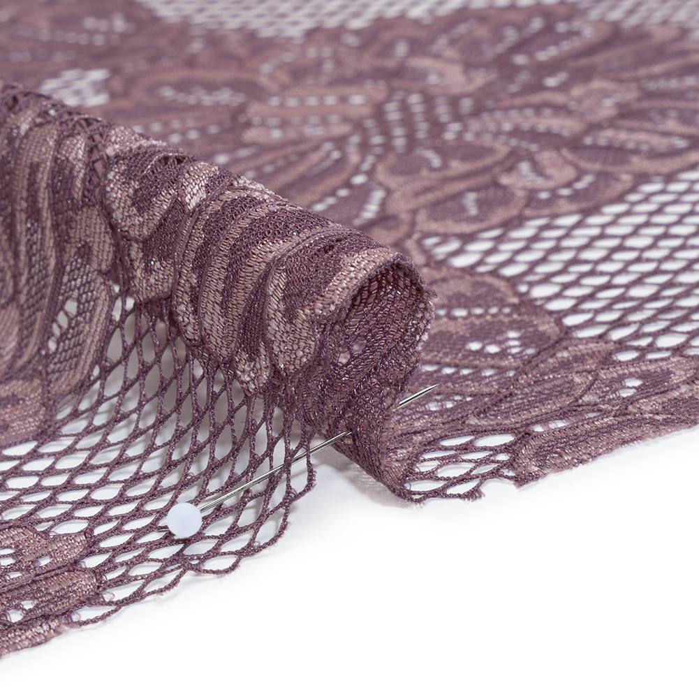 Style will reign when you use this Plum and Burnished Lilac Big Flowers on Diamond Net Corded Raschel Lace Panel with Finished Edges—featuring a sleek, tactile hand and fluid drape.Suggested Projects: Shirts, Skirts, Dresses, LingerieContent: 70% Nylon, 30% PolyesterStretch: NoneOpacity: SheerLarge plum purple flowers bloom across a corded diamond net, their petals highlighted with shimmering burnished lilac threads. This particular lace boasts a sleek, tactile hand—thanks to the delicate cords tracing over its motif—and offers a fluid, subtly weighted drape. Let its alluring weave inspire elegant gowns with sweeping trains, luxurious bodysuits, chic tiered skirts, or even lavish lingerie, all made easier by its beautifully finished edge. Naturally sheer, as all lace is, a lining is recommended whenever opacity is desired. Please note: This is a panel that measures 52” by 54”.
