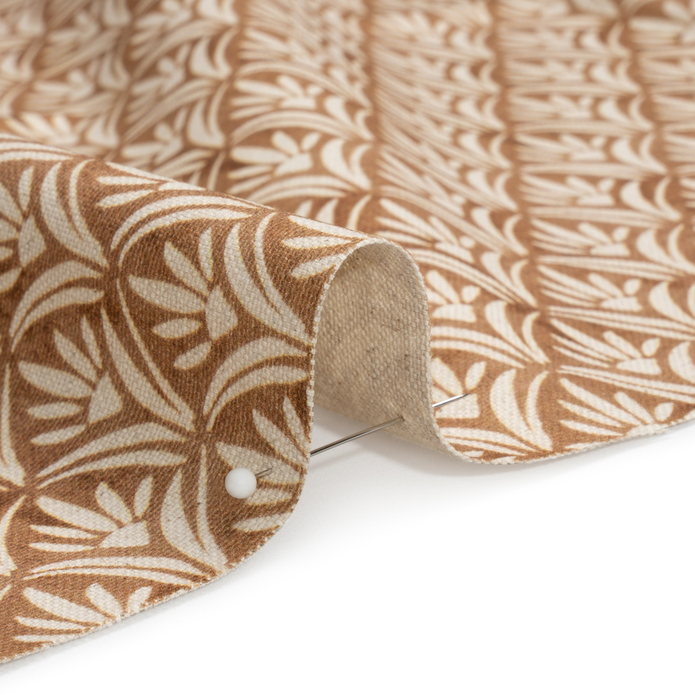 Soft yet bold, this British Imported Bronze Floral Arches Printed Cotton and Linen Canvas emphasizes the warmth in your home. A terracotta background, hazy with light and dark shades, hosts an architectural pattern of floral archways. The pebbly hand, semi-structured drape, and slight transparency create a durable work of art for understated drapery and light upholstery projects.The natural texture of canvas fabrics is rustic in appearance, curating ease and refinement in your home. This simple pattern charms kitchens with valances and inspires throw pillows and headboards—plus, in admiration of its stability, wardrobes can be refreshed with structured jackets and tote bags.