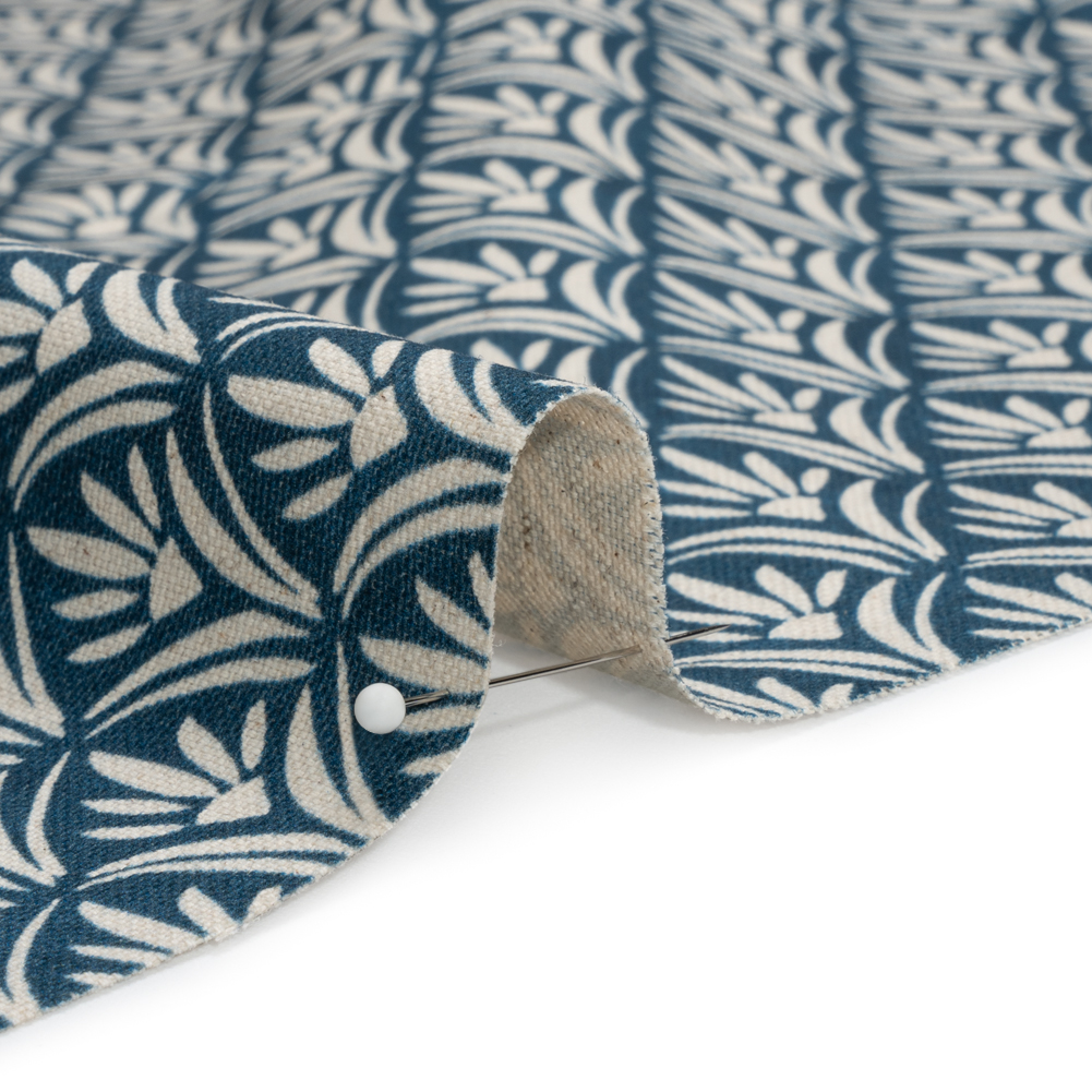 Drape your home in the floral night of this British Imported Midnight Floral Arches Printed Cotton and Linen Canvas. A navy background hosts an architectural pattern of floral archways. The pebbly hand, semi-structured drape, and slight transparency create a durable work of art for understated drapery and light upholstery projects.The natural texture of canvas fabrics is rustic in appearance, curating ease and refinement in your home. This simple pattern charms kitchens with valances and inspires throw pillows and headboards—plus, in admiration of its stability, wardrobes can be refreshed with structured jackets and tote bags.
