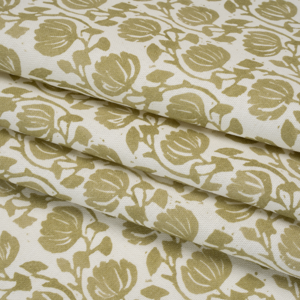 Add the finishing garnish to your creative cocktail with this Olive Block Print Florals Cotton and Linen Canvas—featuring a dry, lightly tactile hand and semi-structured drape.Suggested Projects: Curtains, Throw Pillows, Headboards, JacketsContent: 85% Cotton, 15% LinenStretch: NoneOpacity: Slightly TranslucentBlock-print inspired flowers climb gracefully across the off-white ground in rich hues of olive green, lending artisanal charm and breezy elegance to the fabric. The artist in you will be captivated by canvas—a fabric that dances between rustic charm and refined elegance, ready to find its place in living rooms, kitchens, bedrooms, and even wardrobes. With cotton and linen lending it an easy, breezy nature, its smooth, lightly textured hand and semi-structured drape make it perfect for drapery, headboards, throw pillows, and curtains—or, for the fashion-minded, structured jackets and timeless tote bags. Slightly translucent, it pairs beautifully with a lining for added opacity and polish, if taking the fashion route.