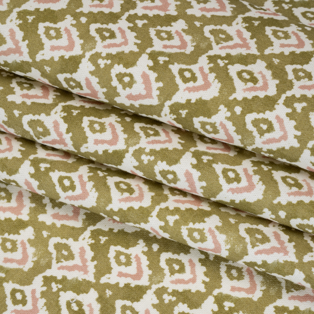 Fall in olive with the muted hues of this Olive Rows of Diamonds Cotton and Linen Canvas—featuring a smooth, lightly textured hand and semi-structured drape.Suggested Projects: Curtains, Throw Pillows, Headboards, JacketsContent: 85% Cotton, 15% LinenStretch: NoneOpacity: Slightly TranslucentOlive green, petal pink, and cream hues form softly abstract rows of diamonds across this fabric, their washed effect evoking countryside coziness and painterly warmth. The artist in you will be captivated by canvas—a fabric that dances between rustic charm and refined elegance, ready to find its place in living rooms, kitchens, bedrooms, and even wardrobes. With cotton and linen lending it an easy, breezy nature, its smooth, lightly textured hand and semi-structured drape make it perfect for drapery, headboards, throw pillows, and curtains—or, for the fashion-minded, structured jackets and timeless tote bags. Slightly translucent, it pairs beautifully with a lining for added opacity and polish, if taking the fashion route.