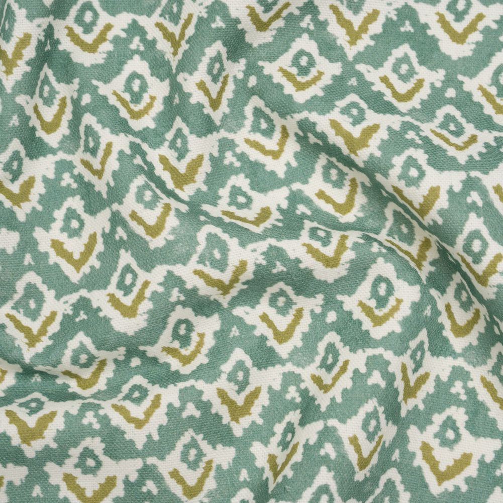 Your dream cozy reading nook is just a stitch away with this Teal Rows of Diamonds Cotton and Linen Canvas—featuring a smooth, lightly textured hand and semi-structured drape.Suggested Projects: Curtains, Throw Pillows, Headboards, JacketsContent: 85% Cotton, 15% LinenStretch: NoneOpacity: Slightly TranslucentTeal, olive green, and cream hues form softly abstract rows of diamonds across this fabric, their washed effect evoking countryside coziness and painterly warmth. The artist in you will be captivated by canvas—a fabric that dances between rustic charm and refined elegance, ready to find its place in living rooms, kitchens, bedrooms, and even wardrobes. With cotton and linen lending it an easy, breezy nature, its smooth, lightly textured hand and semi-structured drape make it perfect for drapery, headboards, throw pillows, and curtains—or, for the fashion-minded, structured jackets and timeless tote bags. Slightly translucent, it pairs beautifully with a lining for added opacity and polish, if taking the fashion route.