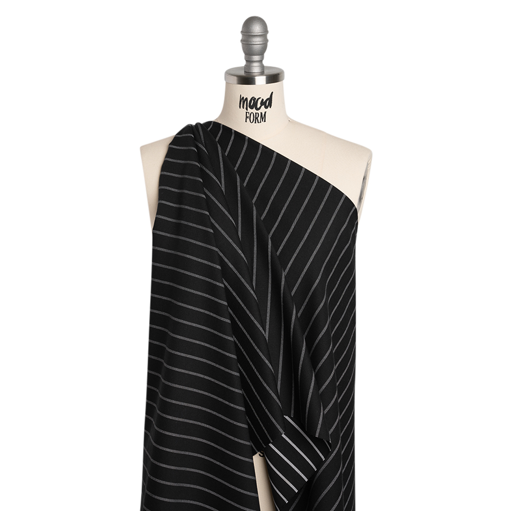 This Black and White Chalk Striped Cotton and Polyester Twill is the write choice for your next design—featuring a soft, lightly tactile hand and fluid drape.Suggested Projects: Blazers, Trousers, Dresses, SkirtsContent: Cotton, PolyesterStretch: NoneOpacity: Slightly TranslucentYou’re sure to earn your stripes once you use this black twill—its white chalk stripes racing towards your next project. Its soft, lightly tactile hand and fluid drape lend themselves naturally to tailored designs, meant to withstand the wear and tear of a busy lifestyle. Use it to craft jackets, structured blazers, straight-leg trousers, overall dresses, mini skirts, and more! Slightly translucent, a lining may be added for structure and a luxurious finish.