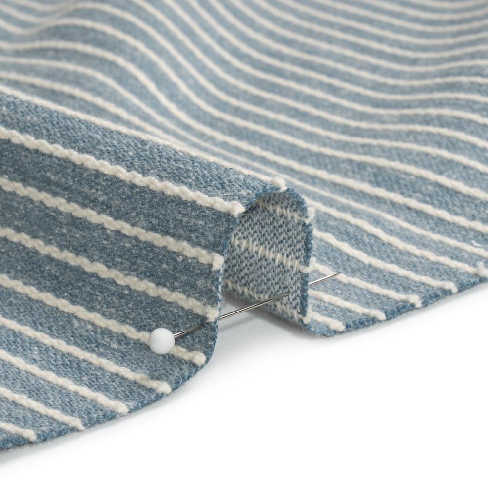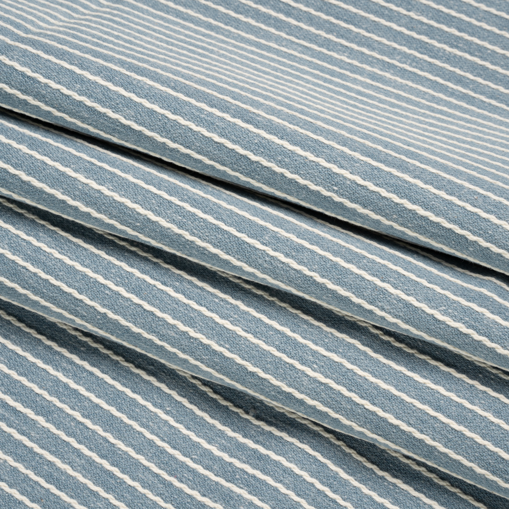 Easy, sweet, and classic, this British Imported Denim Tactile Chalk Stripes Cotton and Polyester Woven flourishes in every home, style, and trend. Raised white pinstripes embellish a woven, light blue base, elevating its charm and visual appeal to dimensional heights. This fabric is sturdy, opaque, and supple in drape; some suggested projects include floor-to-ceiling curtains and valances. Plus, consider light upholstery projects like reupholstered ottomans and headboards!