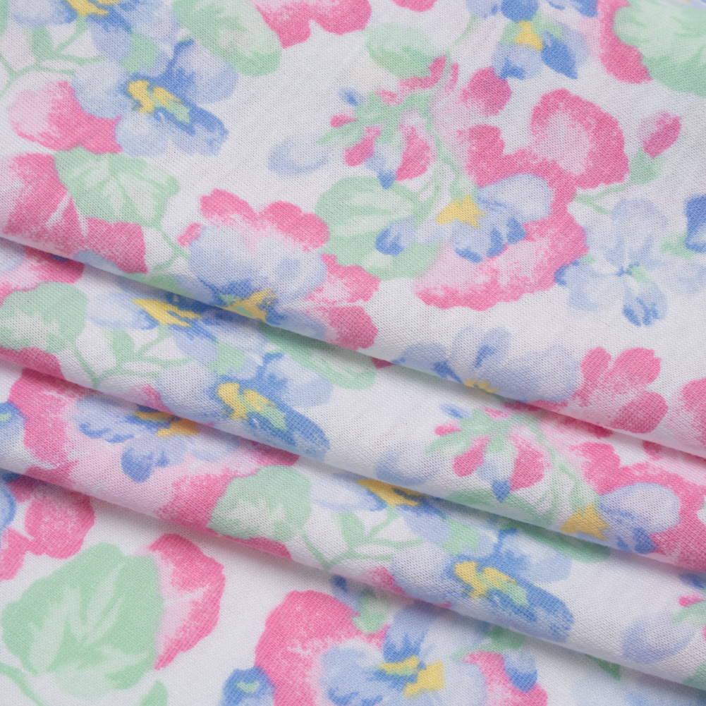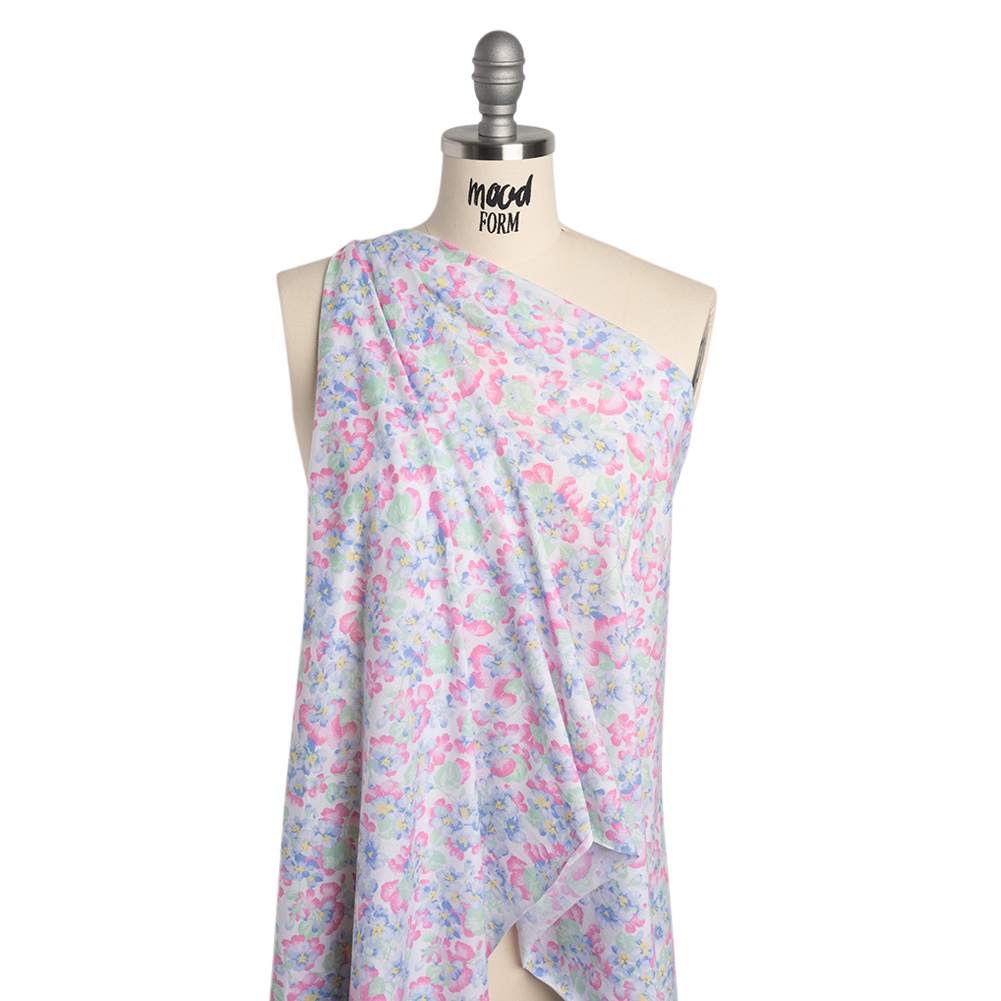 This Floral Cotton and Viscose Jersey Print will give you a spring in your step—featuring a soft, smooth hand and airy drape.Suggested Projects: Summer Pajamas, Shirts, Dresses, Light CardigansContent: 60% Cotton, 40% ViscoseStretch: 25% WeftwiseOpacity: Slightly TranslucentA spring garden awakens atop this white jersey—blooming in hues of pastel blue, pink, and mint green. Soft, airy, and breathable, summer makes will be a breeze—consider cute pajama sets, dreamy fit-and-flare dresses, or slouchy t-shirts made all the more comfortable by a slight stretch through the weft. As this fabric is slightly translucent, it’s ideal for layering over camis or slips.