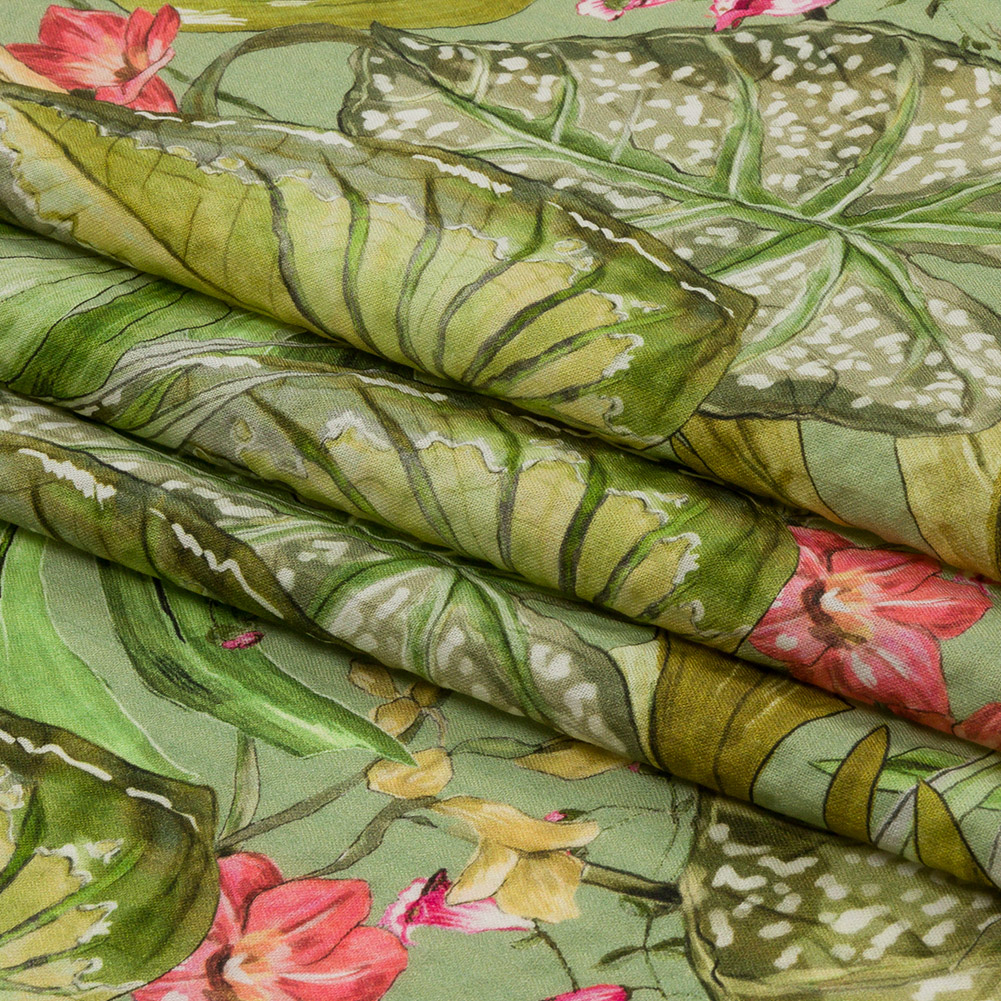 Cotton and Viscose Striped Seersucker Print - Green and Pink Tropical Leaves and Flowers - Mood Exclusive Monstera Mambo