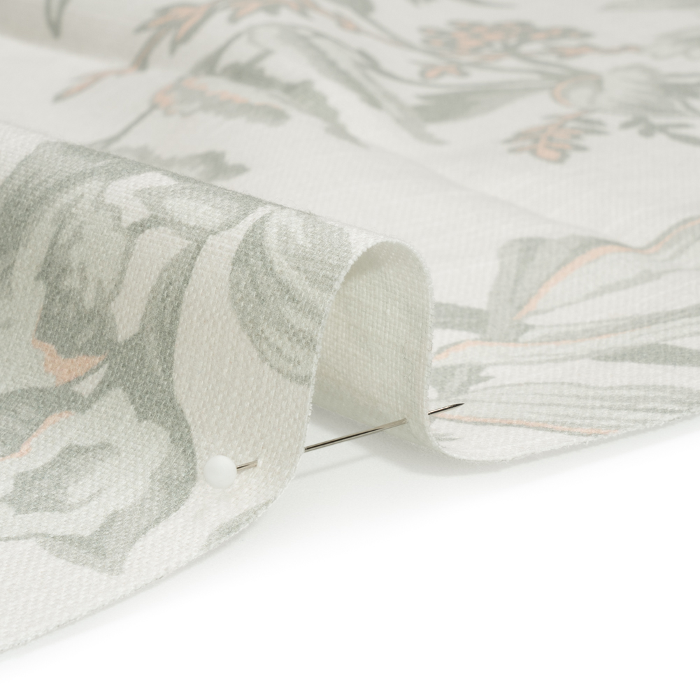 This British Imported Amber Floral Printed Cotton Canvas inspires romance by displaying gray and pale pink flower trees under a white sky. Bringing a rustic feel to the fabric, slubs texture the soft, dry face. It features a semi-structured drape and is transparent. Printed canvas fabrics are charming and simple, offering themselves like a piece of art to living rooms, kitchens, bedrooms, and even wardrobes—while ideal for curtains and light upholstery (like headboards and ottomans), canvas is also great for structured jackets and tote bags!