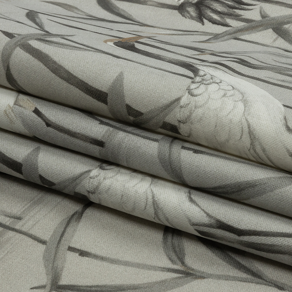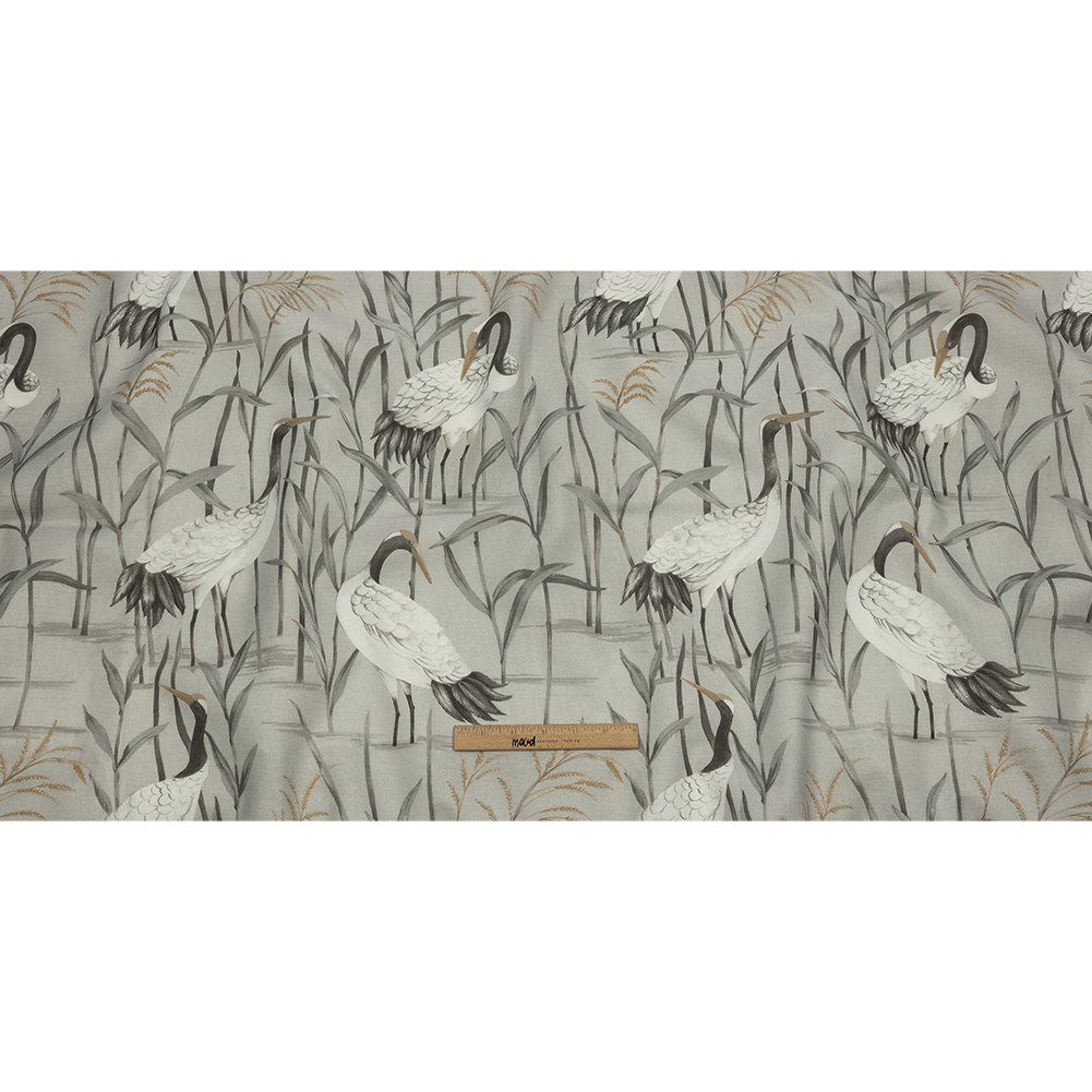On a cloudy canvas, mystic feathered creatures come to life with this British Imported Dove Cranes in the Reeds Printed Cotton Canvas.