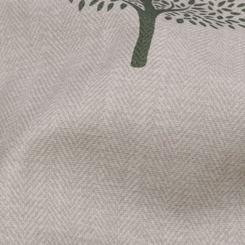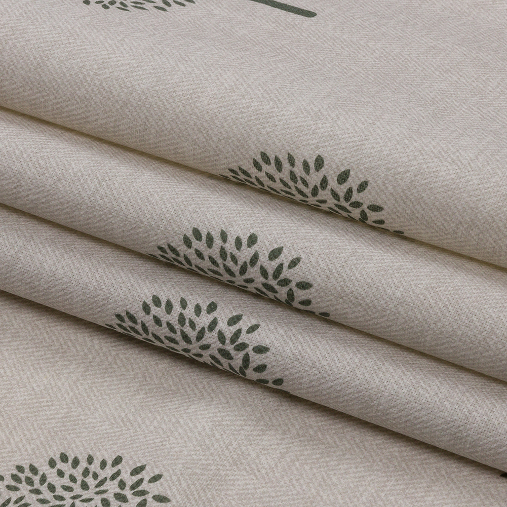 Feel as grounded as the trees with this British Imported Fern Yew Trees Printed Cotton Canvas. Debatably Europe’s oldest tree, the Yew Tree has held meaning in many ancient cultures and religions. Admire the longevity and strength of the Yew, often tied to immortality, on this 100% cotton fabric. These sage green trees breathe life into this fabric as they grow among a light gray field, textured by a subtle herringbone design in the print. This fabric features a crisp hand and a voluminous drape, ideal for drapery and curtains alike. Bring the calming aura of mother nature into your living room with full-length drapes, or create structured valances for your bathroom and kitchen windows. A lining is suggested if full opacity is desired as it is slightly translucent.