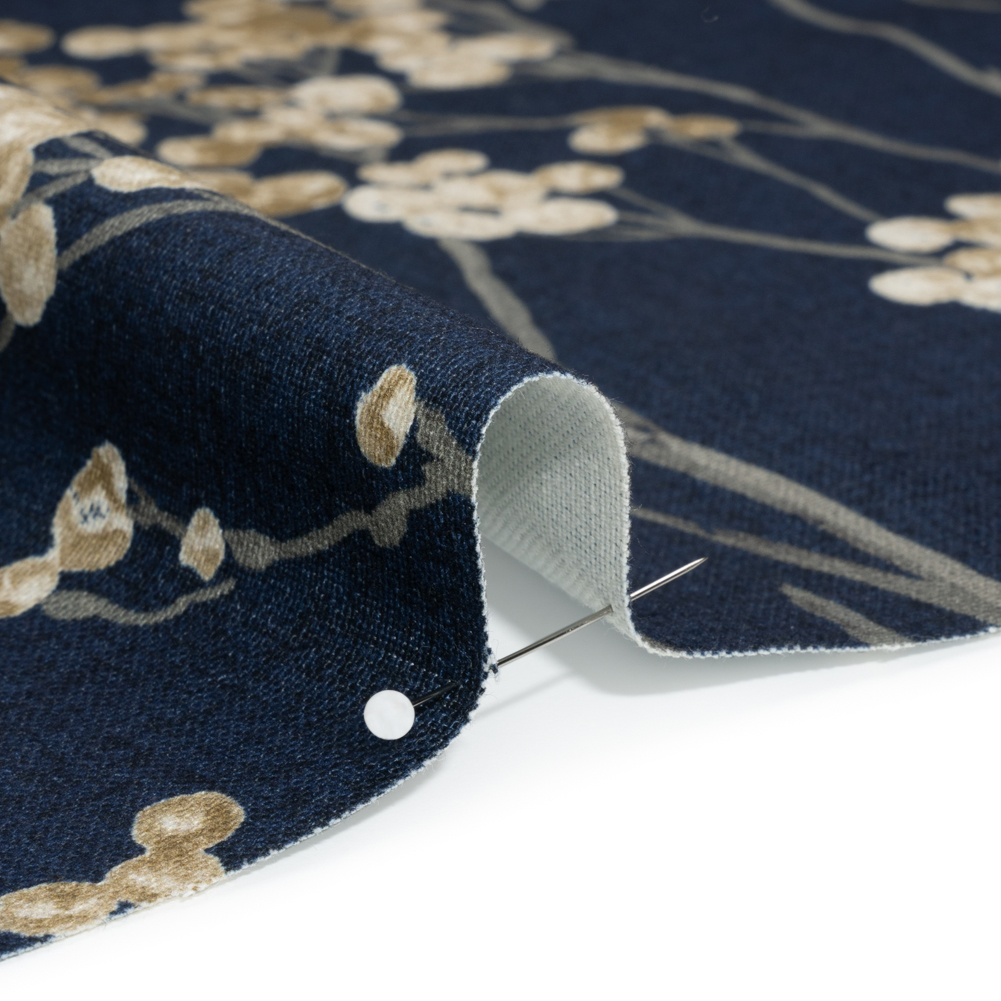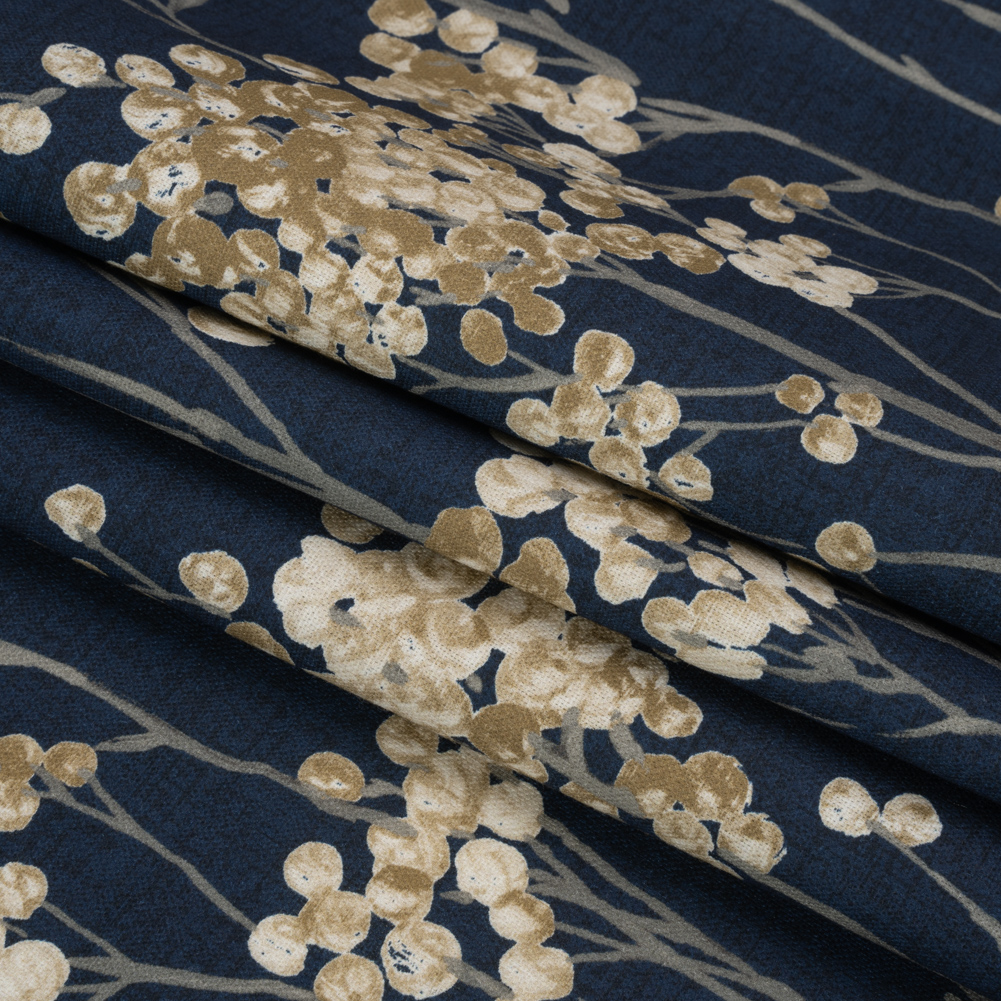 The moonlight catches the newly ripe berries on this British Imported Ink Berry Stems Printed Cotton Canvas. Displaying itself like a piece of art, the dry, flat face paints an image of cream and taupe berry trees against a heathered navy sky. The malleable drape, ideal for valances or semi-structured curtains, brings a timeless look into any room. Plus, you can experiment with reupholstery projects like stools and ottomans! As this fabric is slightly translucent, a lining is suggested for total opacity.