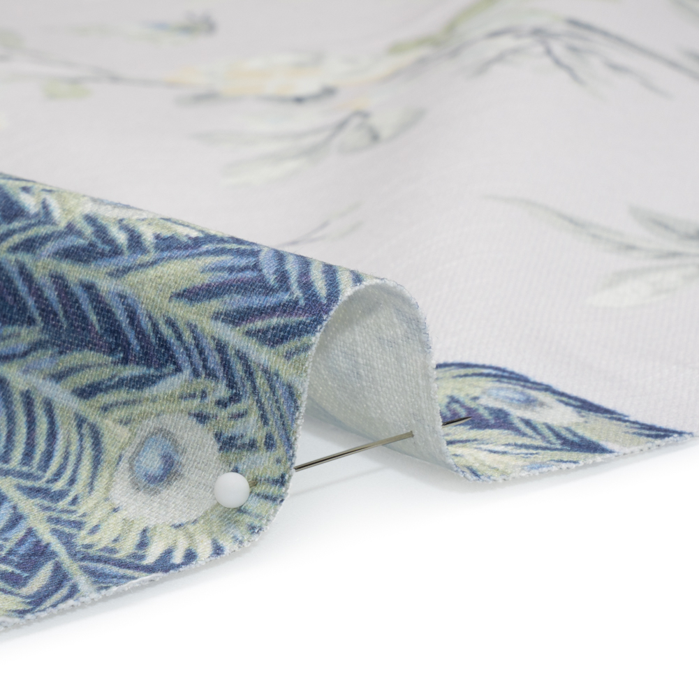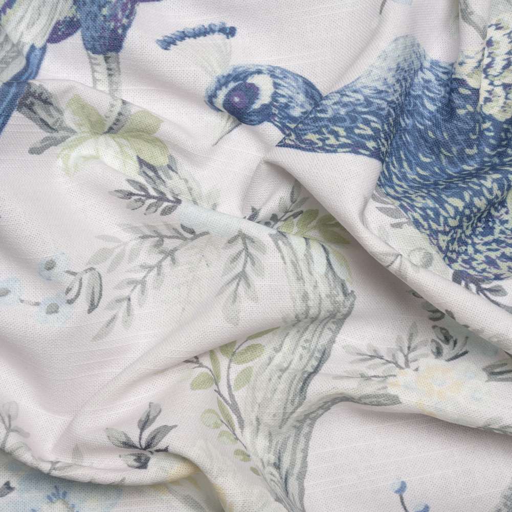 Host an event at your home just to show off this British Imported Midnight Peacocks in the Trees Printed Cotton Canvas! Under a pale lilac-gray sky, a family of regal peacocks perches on flowering trees. The dry and slubbed hand, semi-structured drape, and slight transparency create a durable work of art for down-to-earth drapery and light upholstery projects.The natural texture of canvas fabrics is rustic in appearance, curating a sense of ease and refinement in your home. This elegant design elevates valances, throw pillows, and headboards—plus, in admiration of its stability, wardrobes can be refreshed with structured jackets and tote bags.